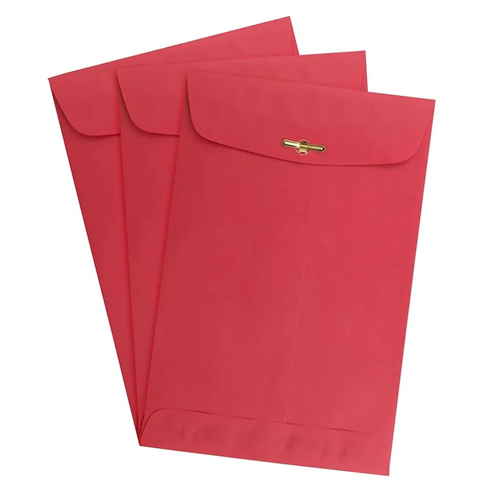 JAM PaperĀ® Red Recycled 6 x 9 Open End Envelopes with Clasp Closures are made out of smooth, high quality, 30% recycled, 24lb paper. This pack contains 10 envelopes. Each one has a straight flap with rounded corners and a reliable, easy-to-use metal clasp closure. There is also an optional gum closure for additional reinforcement. Each one of these open end envelopes measures 6 x 9 inches in size and features a bright and bold red color. This color makes them especially useful for mailings during the Christmas season and around the time of Valentine’s Day. Use them to send letters, promotional materials, holiday cards and more!