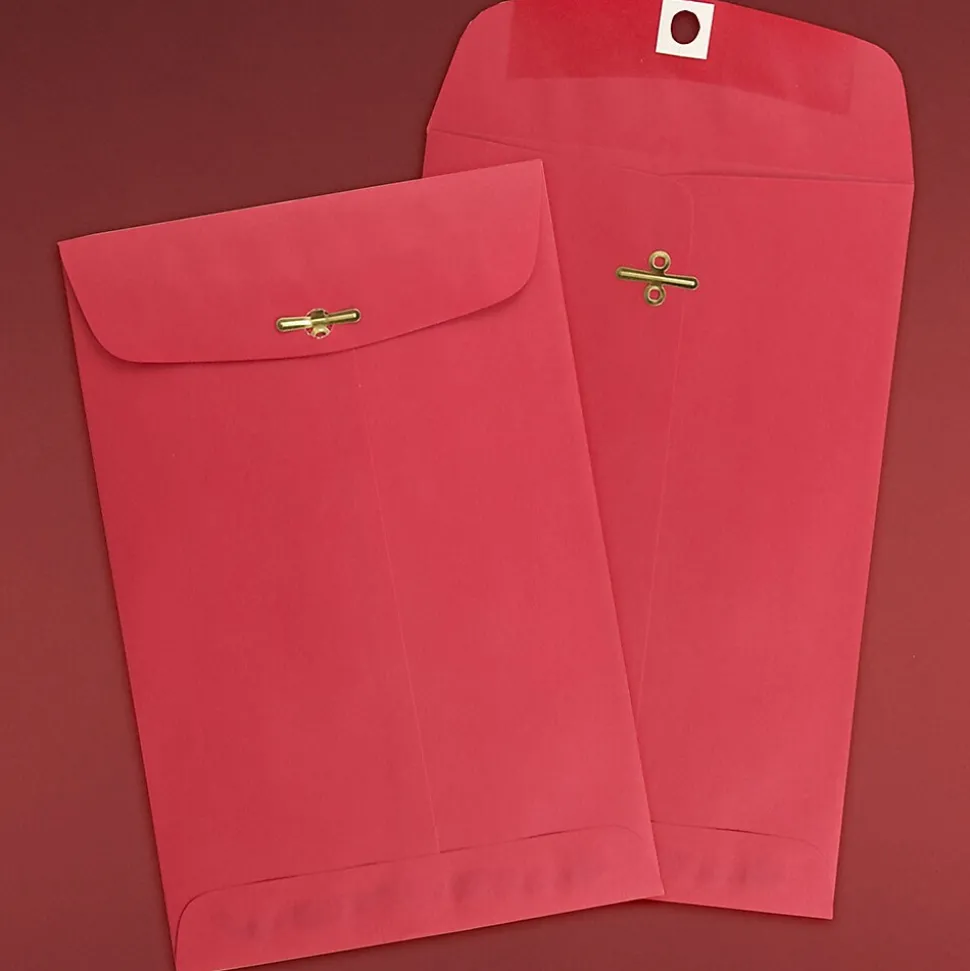 JAM PaperĀ® Red Recycled 6 x 9 Open End Envelopes with Clasp Closures are made out of smooth, high quality, 30% recycled, 24lb paper. This pack contains 100 envelopes. Each one has a straight flap with rounded corners and a reliable, easy-to-use metal clasp closure. In addition, they haveoptional gum closures for extra reinforcement. Each one of these open end envelopes measures 6 x 9 inches in size and features a bright and bold red color. This color makes them especially useful for mailings during the Christmas season and around the time of Valentine’s Day. Use them to send letters, promotional materials, holiday cards and more!