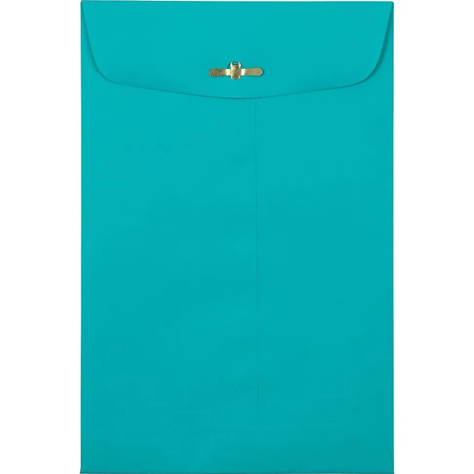 JAM Paper Sea Blue Recycled 6 x 9 Open End Envelopes with Clasp Closures feature a bright and eye-catching shade of sea blue and are made out of high quality, smooth, 30% recycled, 24lb paper. This pack contains an even total of 10 envelopes. Each one measures 6 x 9 inches in size and opens on the shorter end. To keep the contents placed inside of them secure, these envelopes have commercial style flaps with reliable and easy-to-use metal clasp closures. Each one also has an optional-use gum closure for additional reinforcement. Use these envelopes to send letters, documents, promotional materials, invitations, and more!