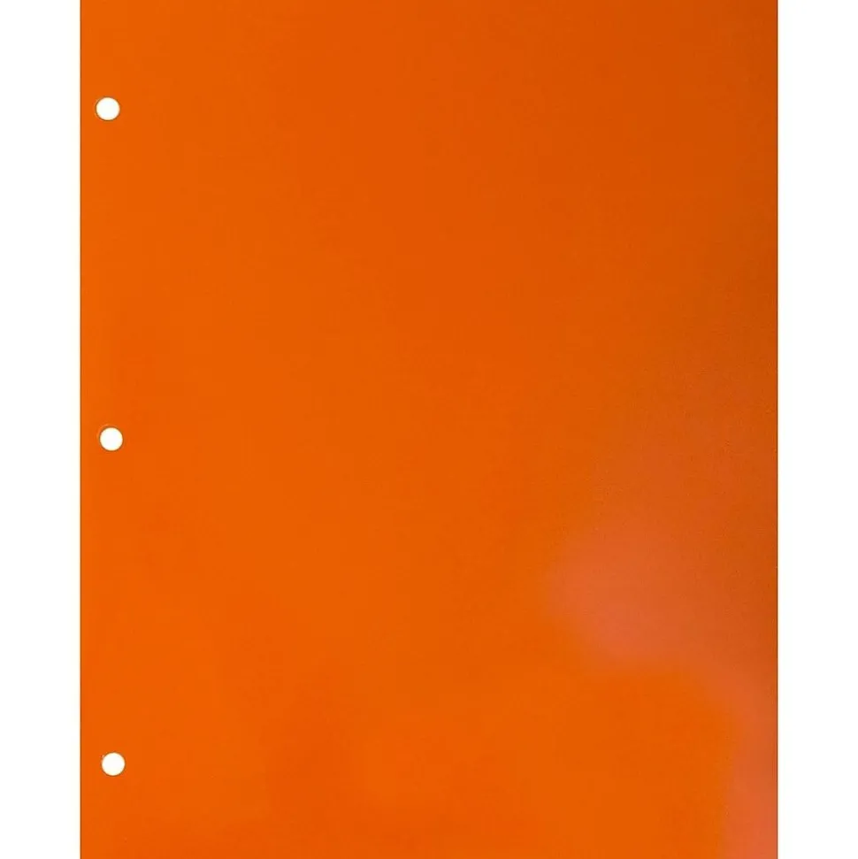 JAM PaperĀ® Orange Glossy Two Pocket 3 Hole Punches Presentation Folders are made out of durable 100lb cardstock, measure 9 x 12 inches, and feature a vibrant orange, glossy finish! These folders are sold in large packs of 100 folders. For efficient sorting and securing of your stranded sized documents, these folders feature two pockets on the inside. The right side pocket includes a business card slot for holding and displaying your professional information and note cards. If you want to store and carry these folders inside 3 ring binders, there are three punch-out holes provided for this purpose. Use these folders to protect, organize, and carry your papers and notes!