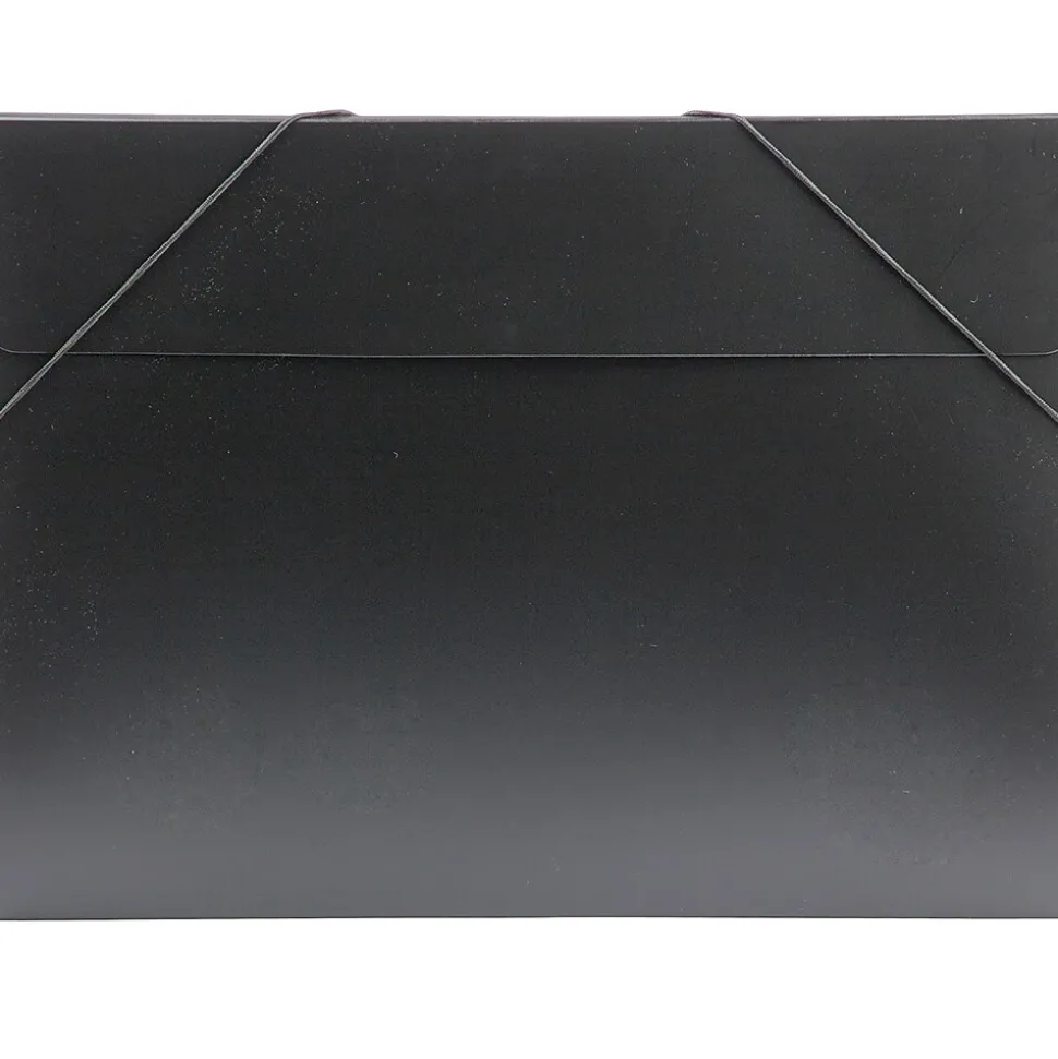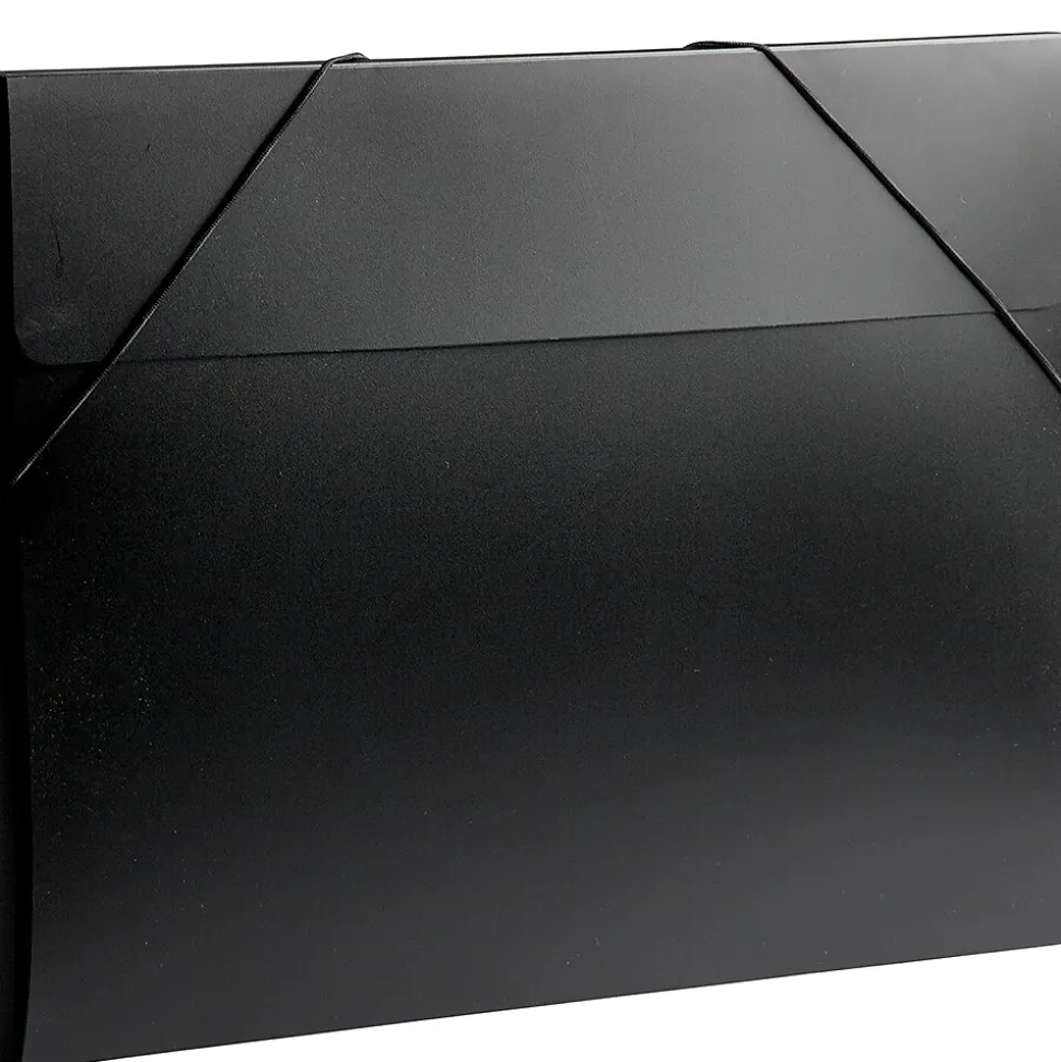 JAM PaperĀ® Black Large Plastic Portfolio with Elastic Closure is sold individually and measures 11 x 15 x 0.5 inches in size. This portfolio features a sleek and professional jet black color and is made out of smooth and durable poly plastic. With a basic booklet design, this portfolio opens with a straight flap and has an elastic closure. This closure is composed of one strand of black elastic string that is attached to the case near the top and near the middle. The two free portions of this strip wrap around the two corners in the front to keep the portfolio closed. Use this versatile portfolio case to carry, store, and protect important documents, files, and more!
