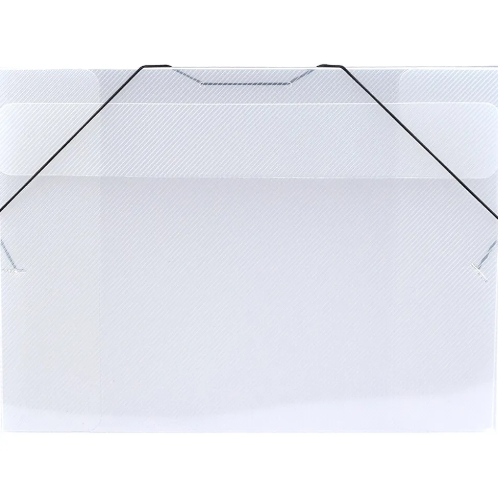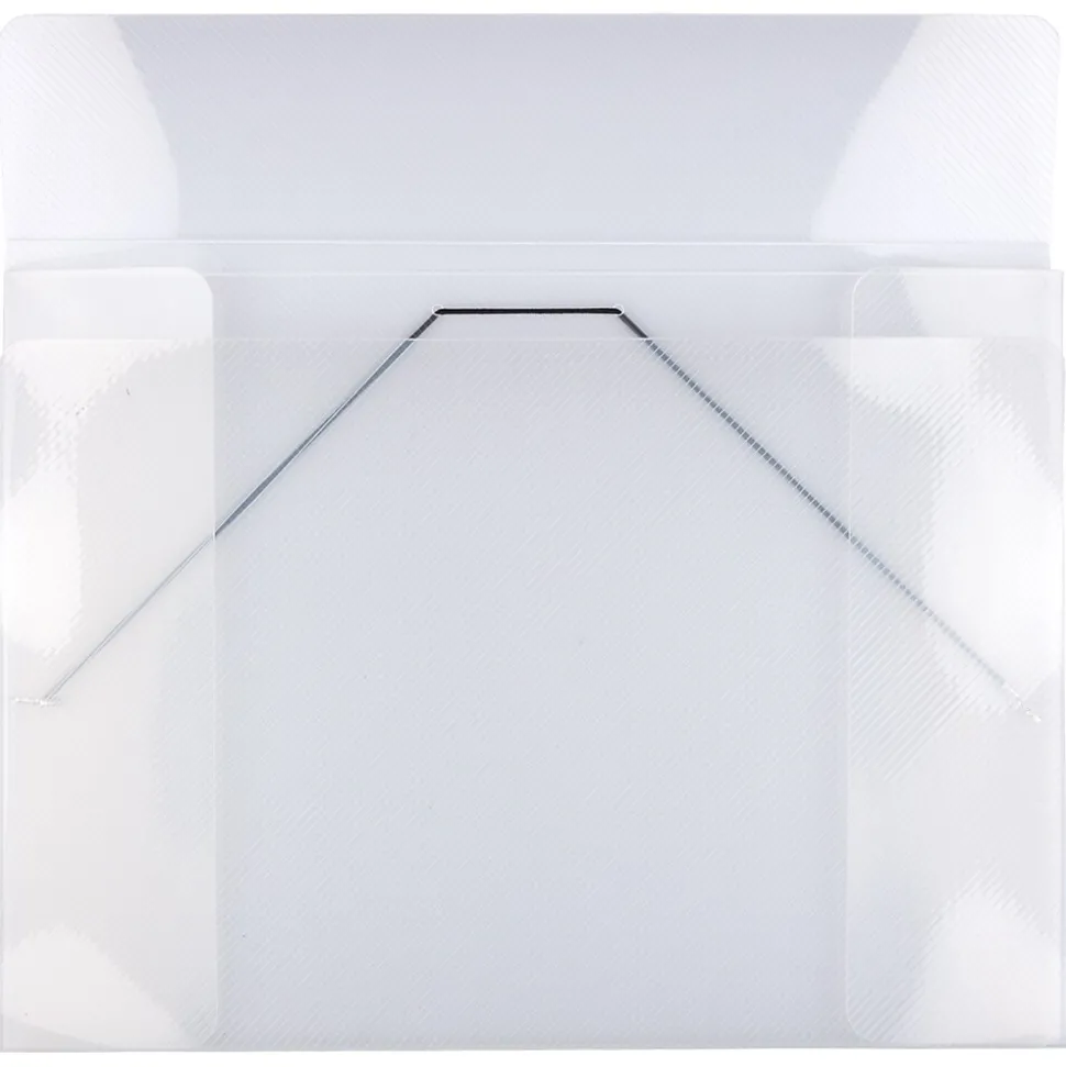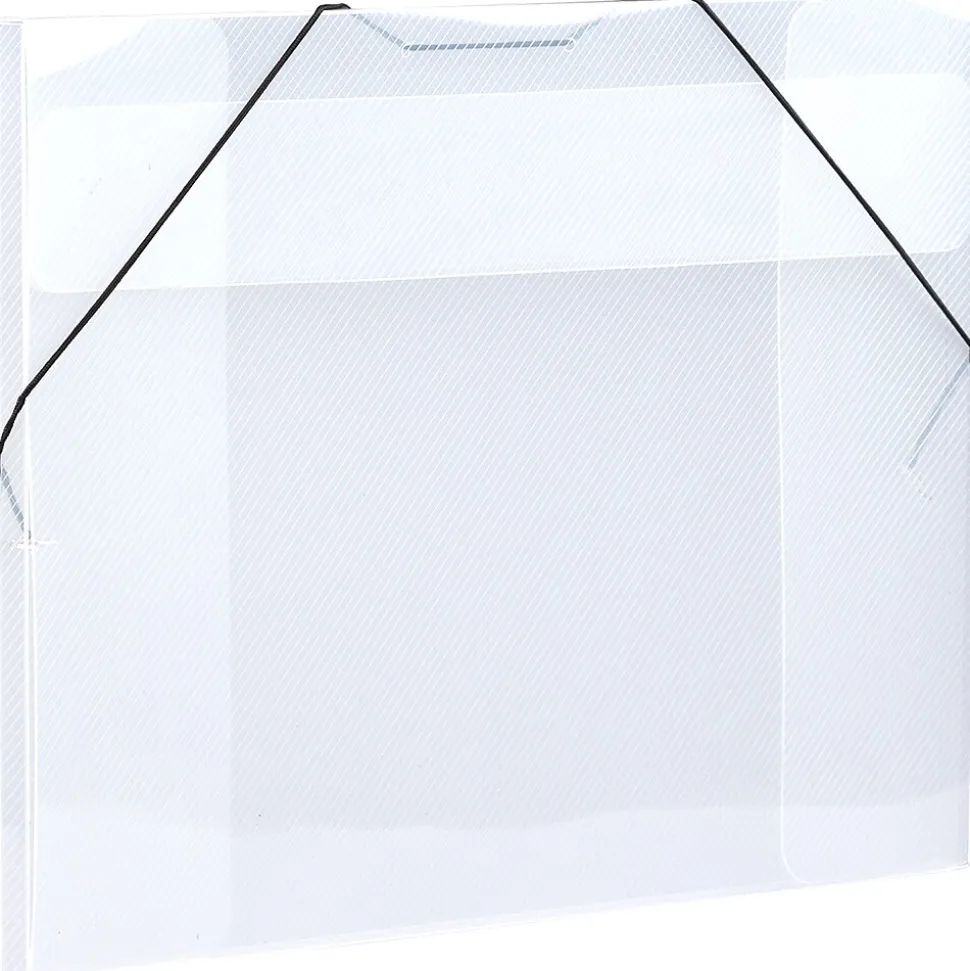 JAM PaperĀ® Clear Grid Large Plastic Portfolio with Elastic Closure measures 11 x 15 x 0.5 inches in size and are made out of durable, transparent plastic. Sold individually, this portfolio is an excellent supply for keeping, carrying, and protecting your important documents, files, projects, forms, paperwork, smaller office supplies, and more! The full front cover of this portfolio flips upward and back In order for it to be opened. There is a single strand of black elastic string these is threaded through the bottom middle and attached to the back middle of both sides. The free portions of this string wrap around the bottom corners of the case in the front to keep it closed.