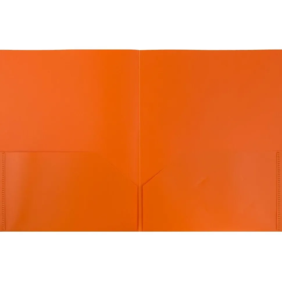 JAM Paper Orange Plastic Eco Two Pocket Presentation Folders are made out of innovative , earth-friendly plastic and have a smooth, pliable texture. This pack comes complete with a total of 6 folders! Each one measures 9 x 12 inches, just a little larger than most standard sized documents. Each one has two pockets on the inside with a business card slot in the right side pocket. Their striking orange color helps them stand out among the rest of your school or office supplies to help you find your stored documents quickly and easily! Maximize your organization, brighten up your space, and be kind to the environment with these orange folders!