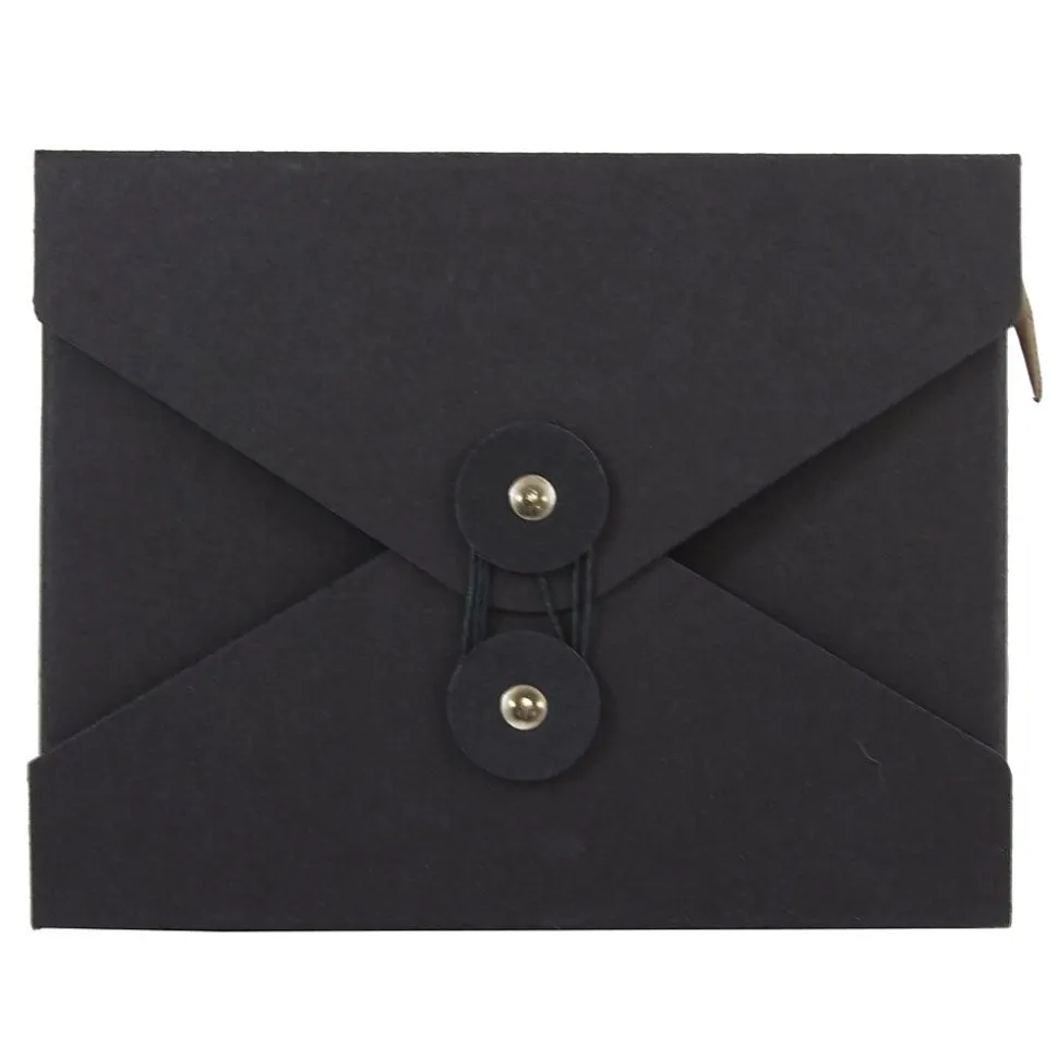 JAM PaperĀ® Black Recycled Small Kraft Portfolio with Button and String Tie Closure is made out of smooth, durable, and environmentally friendly 100% recycled chipboard. This portfolio case is sold individually and measures 5.25 x 6.75 x 1 inches in size. It is the ideal case for carrying and protecting index cards, small memos, and small office supplies such as pens or pencils in your office or workspace. Certain to appear professional in any environment, this portfolio features a jet black color and a vflap opening. To keep it securely closed, it features a two-button and string-tie closure. The buttons of this closure match the surface of the case in color and in material. The string that wraps arou8nd them is also jet black.