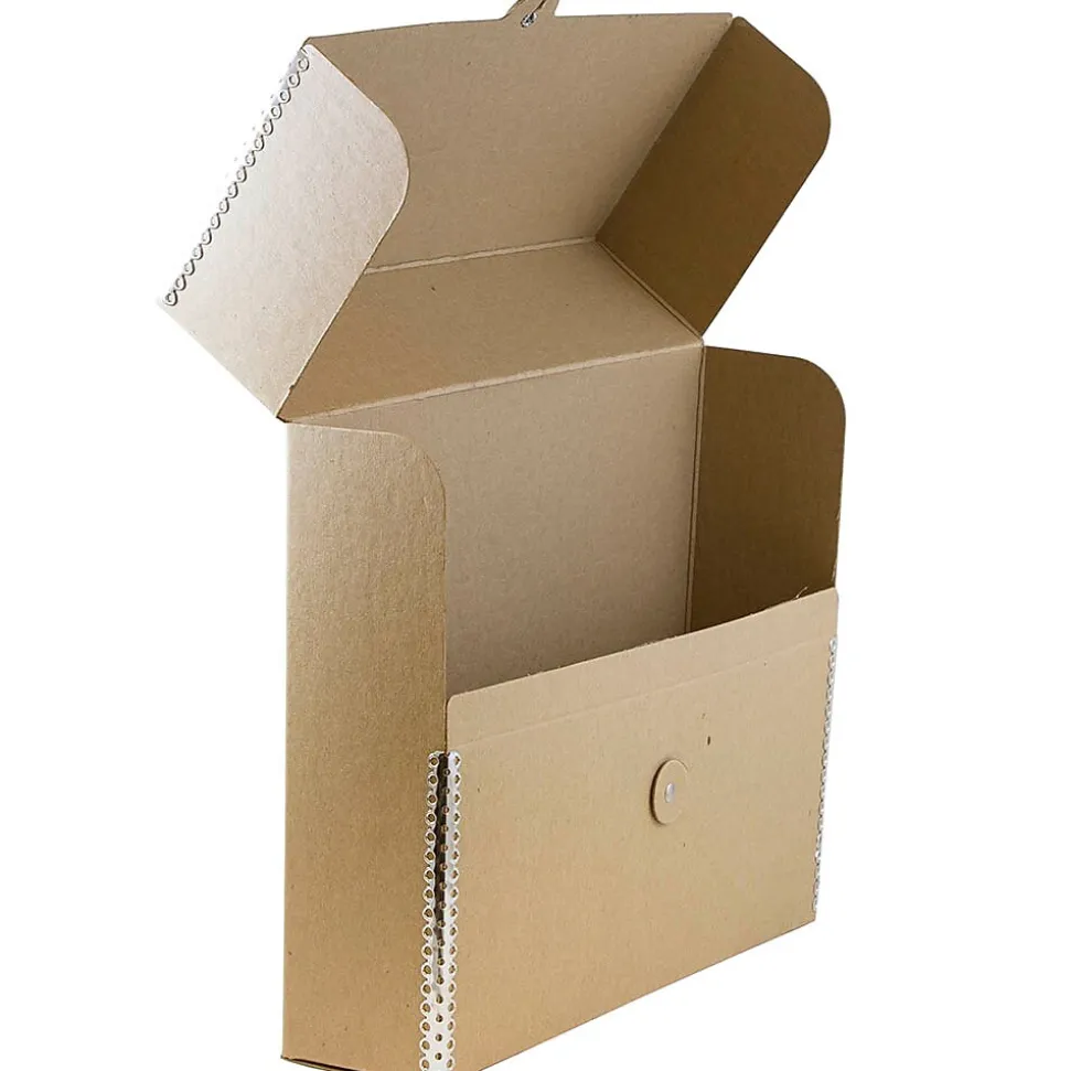 JAM PaperĀ® Brown with Metal Edge Medium Extra Wide Kraft Button and String Tie Portfolios are sold individually and are made out of smooth, durable, earth friendly, 100% recycled chipboard. This portfolio case measures 9.5 x 12 x 2.75 inches in size, which makes it great for standard sized sheets of paper and files. The light, natural kraft brown color of this case looks great in any office, dorm room, locker, or work space! The edges of this portfolio are decorated with thin, silver colored metal strips that feature hollow circle shapes. Each one these portfolio boxes has a straight flap and a brown two-button and string tie closure.