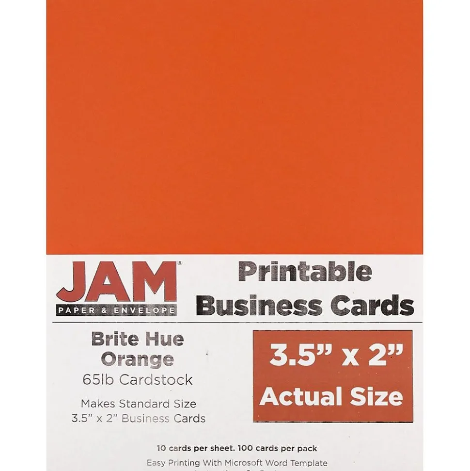 JAM Paper® Brite Hue Orange Printable Business Cards are made of durable 30% recycled 65lb cardstock. These cards are sold in packs of 10 sheets. Ten cards are included within each sheet for a total of 100 cards! Each individual card measures 3.5 x 2 inches. With perforated edges, they can be easily separated. The vivid orange color of these cards is sure to warrant the attention of all who see them. These cards are compatible with most home printers! Eliminate the risk of having ordered business cards delivered with incorrect or obsolete information by creating your own business cards! Take advantage of the freedom to represent yourself and your business in your own way.