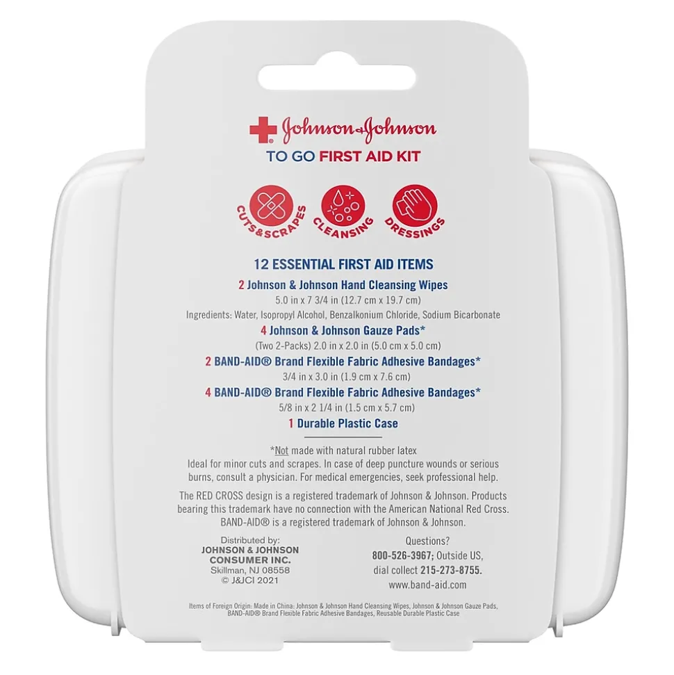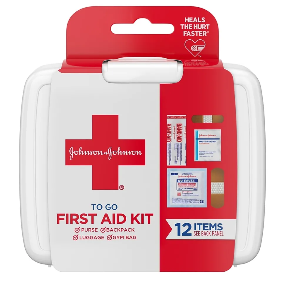 - 12-piece Johnson & Johnson First Aid To Go! Essential Emergency Travel First Aid Kit is ideal for camping trips, vacations, sporting events, or to keep in the car