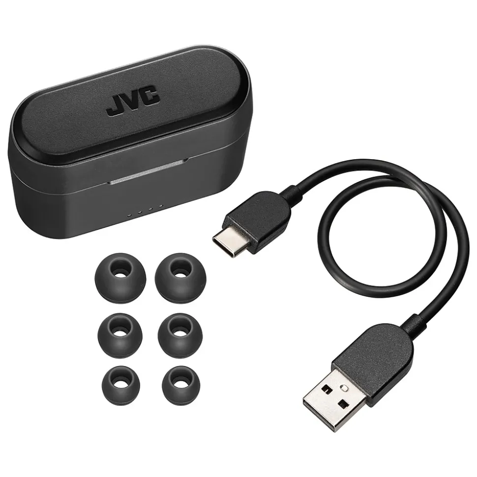 The Black JVC RIPTIDZ True Wireless Earbuds with their cool 2-tone color design use Bluetooth 5.1 technology for a dependable connection and high-quality sound. Touch sensors provide simple and smart operation. These wireless earbuds come with a compact charging case, delivering up to 30 hours of playback. A quick 15-minute charge provides 90 minutes for music and movies. The Bluetooth earbuds are also waterproof IPX5 rated. Several sizes of earbud tips are provided. If the size of the earbud tips does not match the size of your ear canals or the earbuds are not worn properly in your ears, you may not obtain the correct sound qualities or call performance. In that case, change the earbud tips to ones that fit more snugly in your ears.