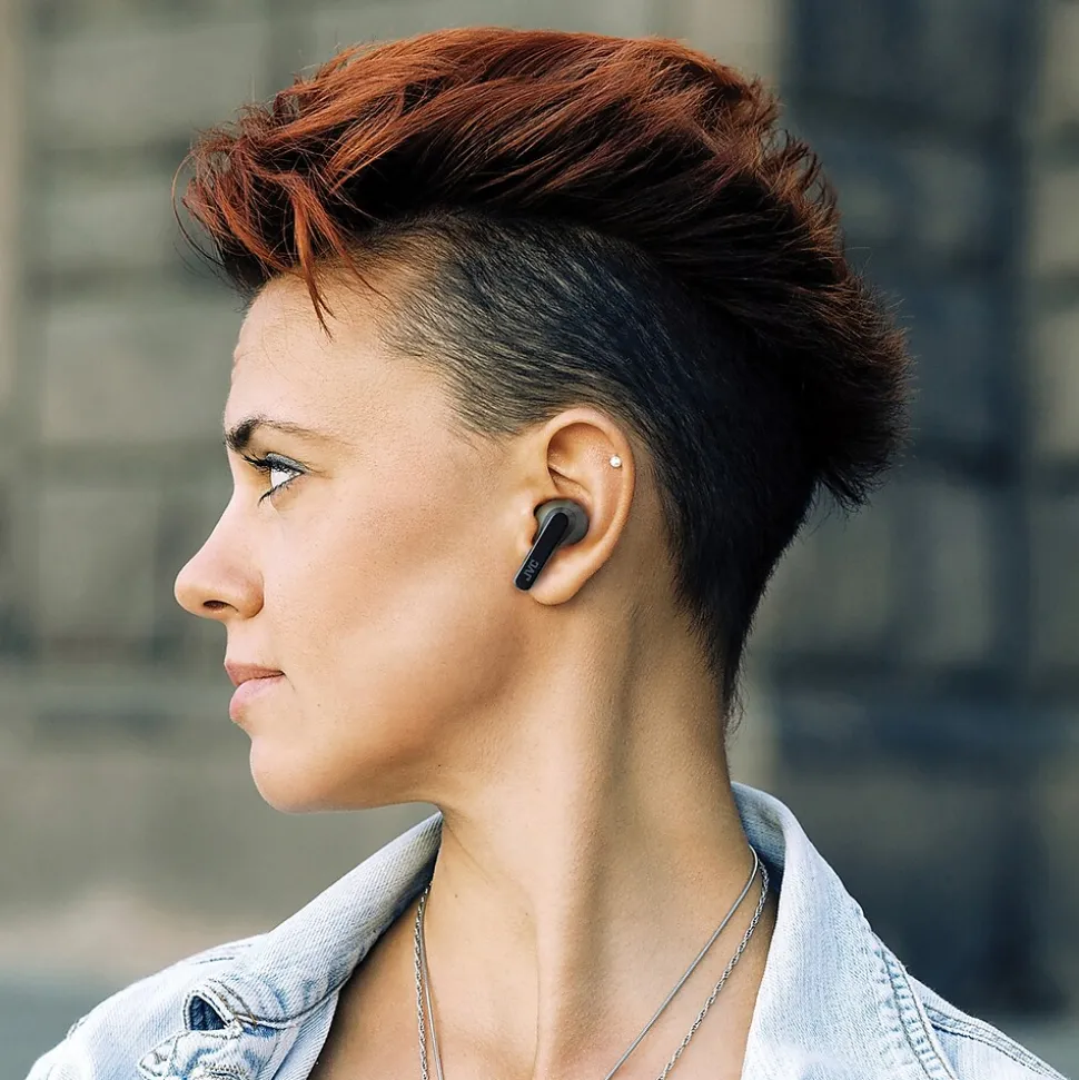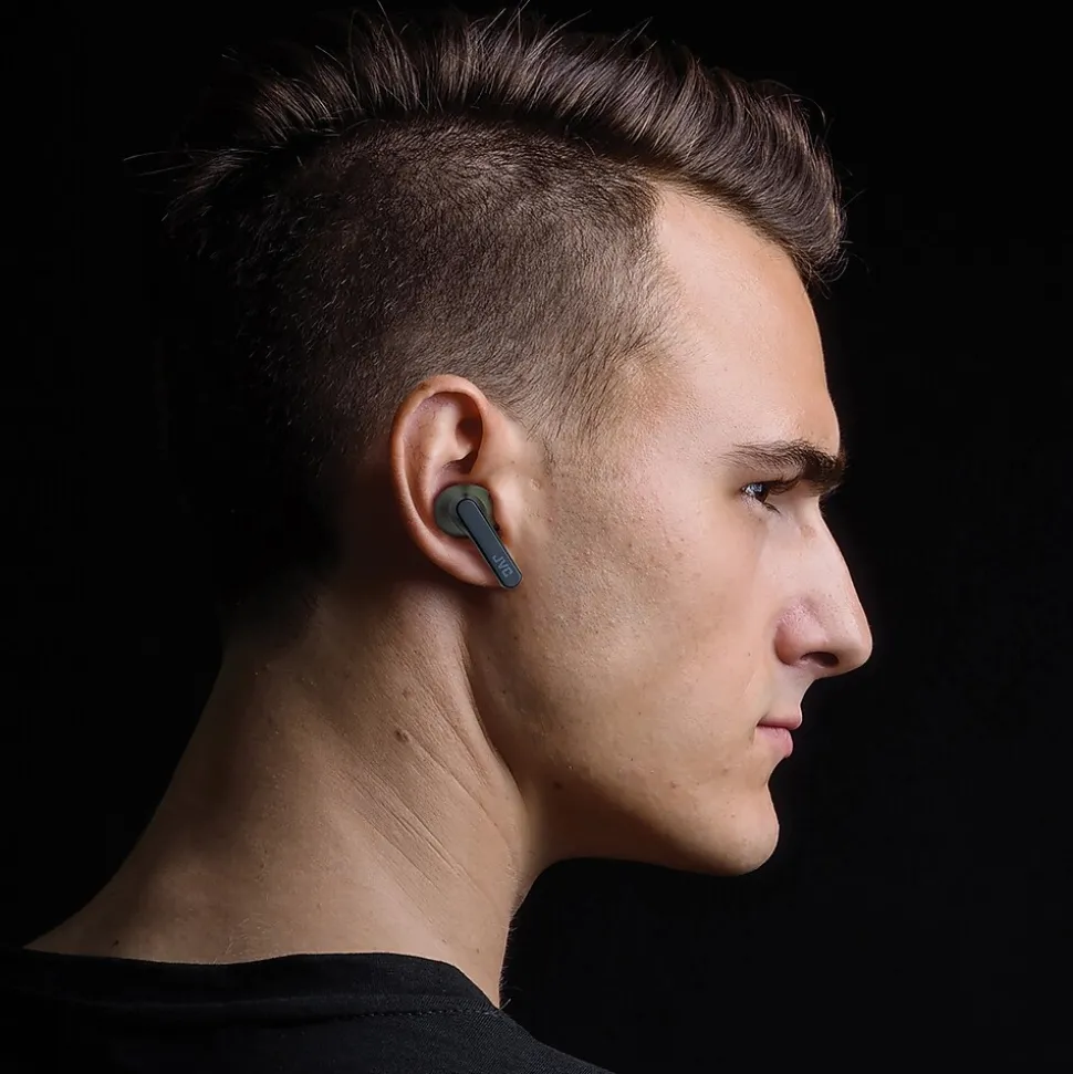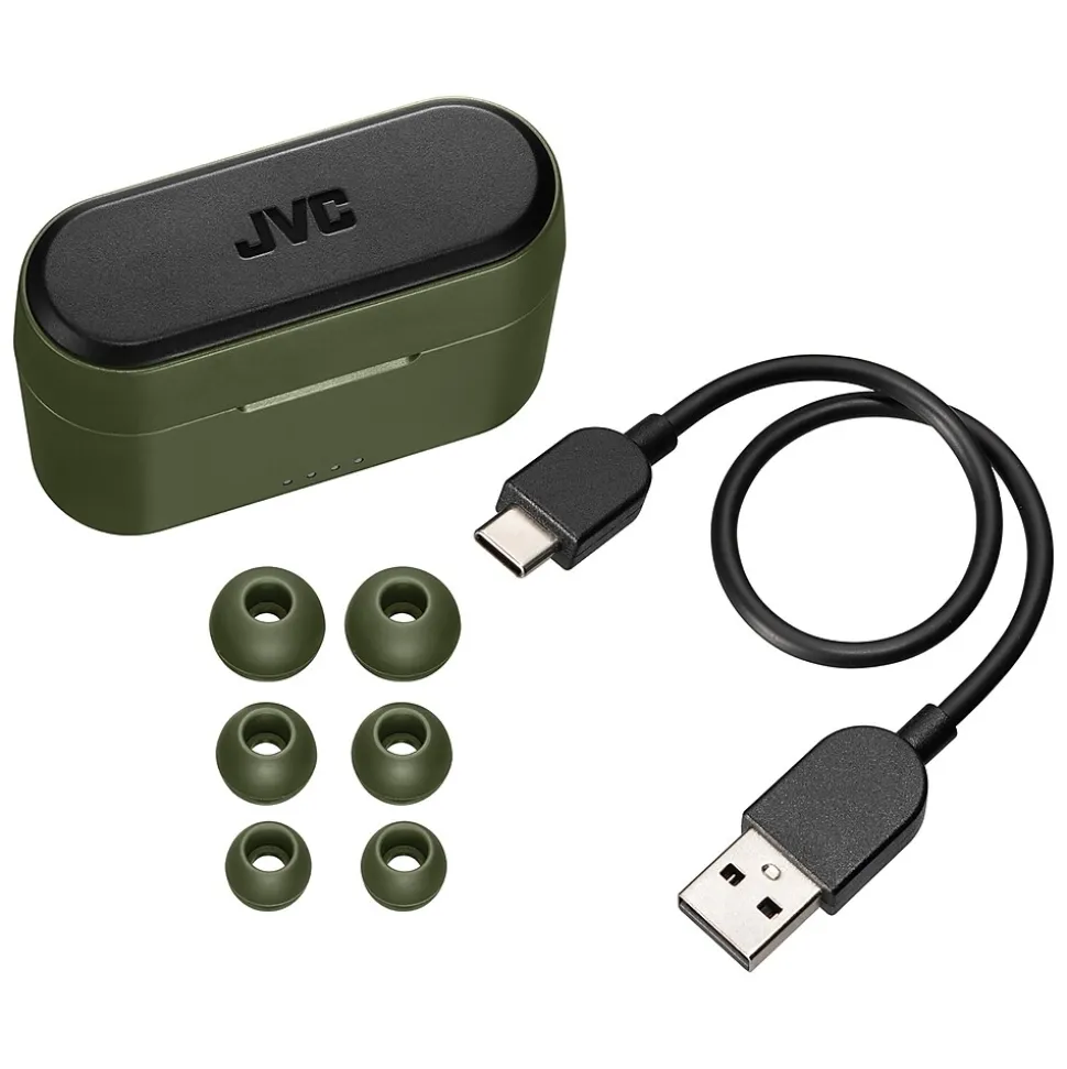 The Olive JVC RIPTIDZ True Wireless Earbuds with their cool 2-tone color design use Bluetooth 5.1 technology for a dependable connection and high-quality sound. Touch sensors provide simple and smart operation. These wireless earbuds come with a compact charging case, delivering up to 30 hours of playback. A quick 15-minute charge provides 90 minutes for music and movies. The Bluetooth earbuds are also waterproof IPX5 rated. Several sizes of earbud tips are provided. If the size of the earbud tips does not match the size of your ear canals or the earbuds are not worn properly in your ears, you may not obtain the correct sound qualities or call performance. In that case, change the earbud tips to ones that fit more snugly in your ears.