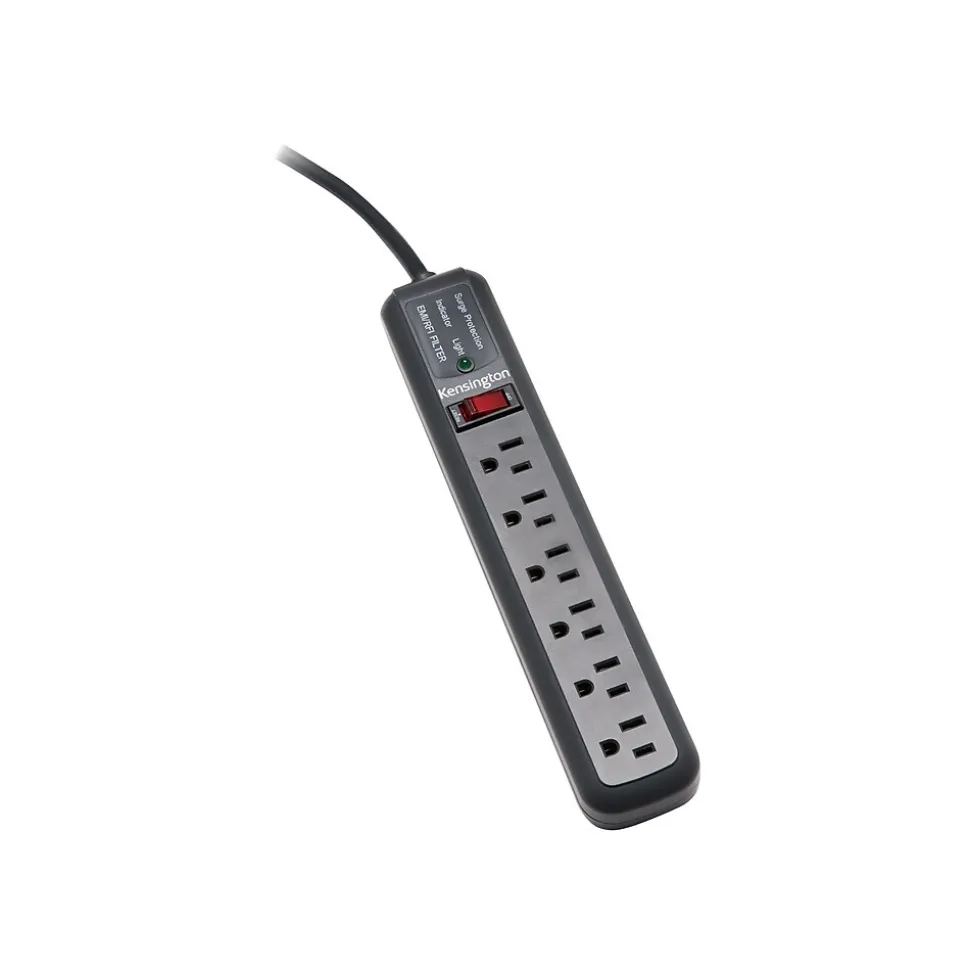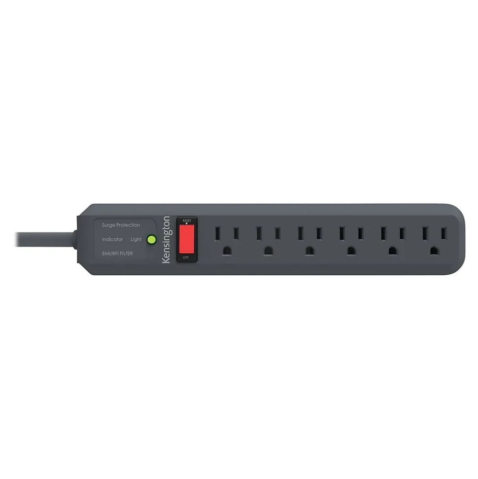 Create a central power hub for a computer and peripherals or other office electronics with this surge protector. Six thoughtfully spaced three-prong outlets make it easy to plug in all your essential devices, while the single switch lets you shut off the power source to all items simultaneously. A handy indicator light gives you a quick alert when surge protection is working. This power strip features a generously sized 15-foot cord, providing flexible placement options behind a desk, cubicle partition, or media stand. With a low-profile design and neutral gray color scheme, this Kensington Guardian 540-joule surge protector blends seamlessly with your equipment and office decor.