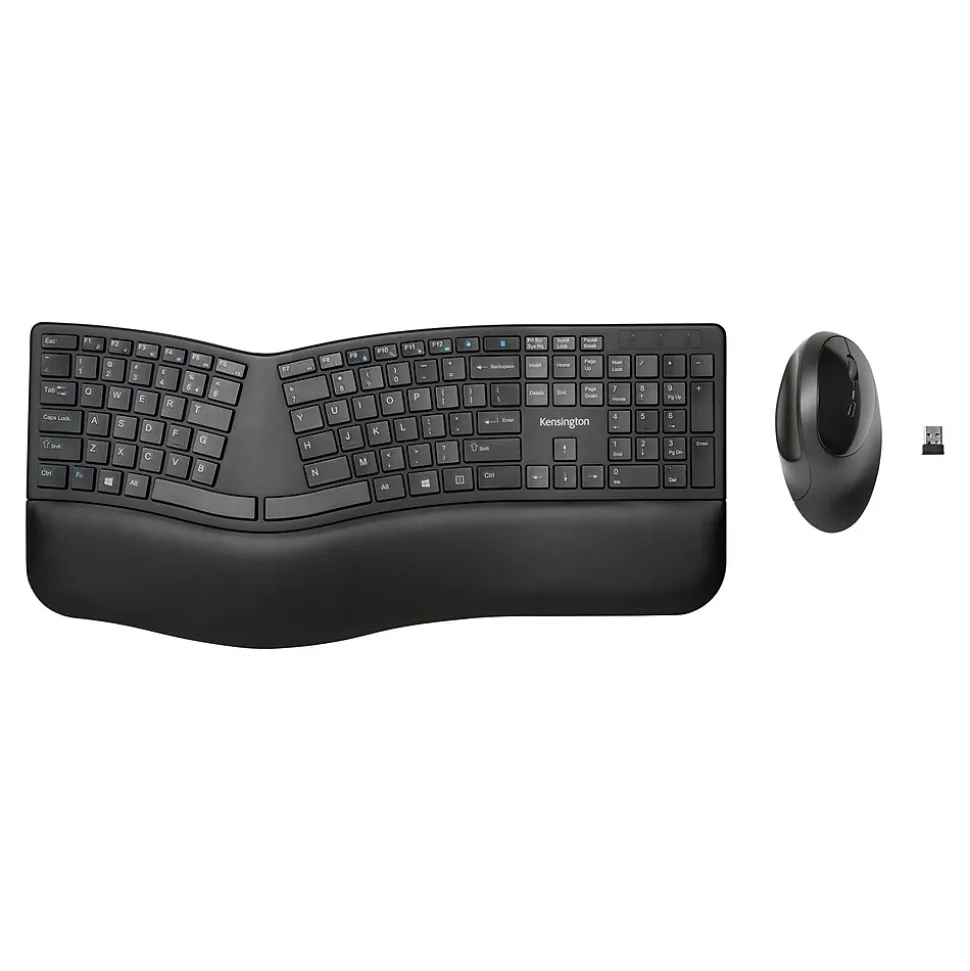 The Kensington Pro Fit Ergo split and sloped keyboard comes with adjustable reverse tilt, built-in wrist support, and neutral grip. The ergonomist-approved wireless keyboard and mouse position your hands for improved comfort. The features include dual wireless connectivity (2.4GHz and Bluetooth 4.0 LE) with 128-bit AES encryption security; quiet typing and clicking; spill-proof keys; F-keys for shortcuts; caps lock, number lock, and scroll lock; low battery indicator lights; a five-button (including forward and back) mouse; three-mode power-saving switches; and a replaceable receiver. In the event the receiver is lost or damaged, simply purchase a new one, pair it with your mouse, and you’re all set.