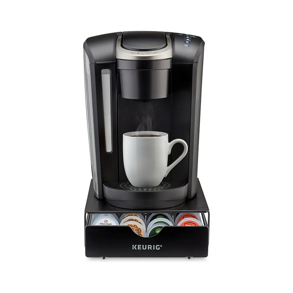 The Keurig slim storage drawer is a small, space-saving pod storage solution. Its durable, stationary design provides easy access to 24 of your favorite K-Cup pods. The slim storage drawer fits conveniently underneath your Keurig coffee maker, keeping you organized without taking up any additional space on your countertop.