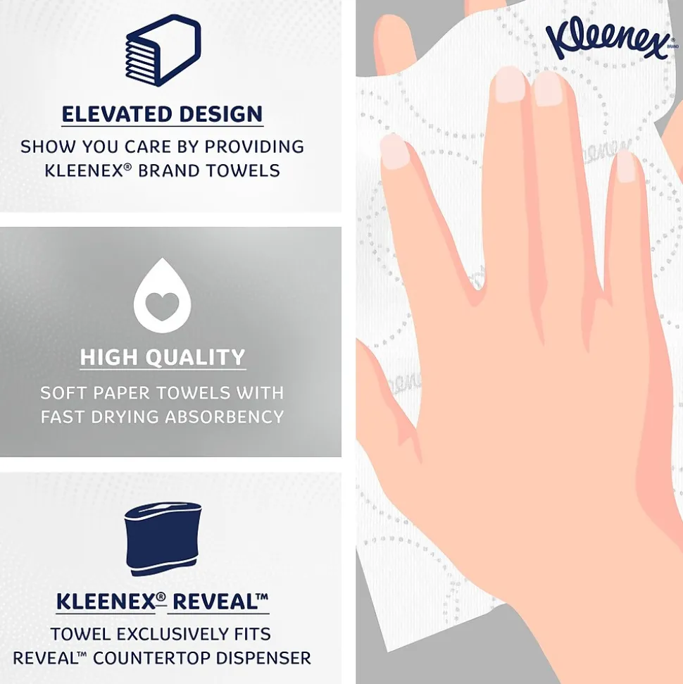 - 150 Sheets/Pack, 16 Kleenex® Reveal™ Multifold Towel Packs/Case; 2,400 Sheets/Case; 2-Ply; for Kleenex® Reveal Countertop System Dispenser; 7.5″ x 9.4″ sheets; White