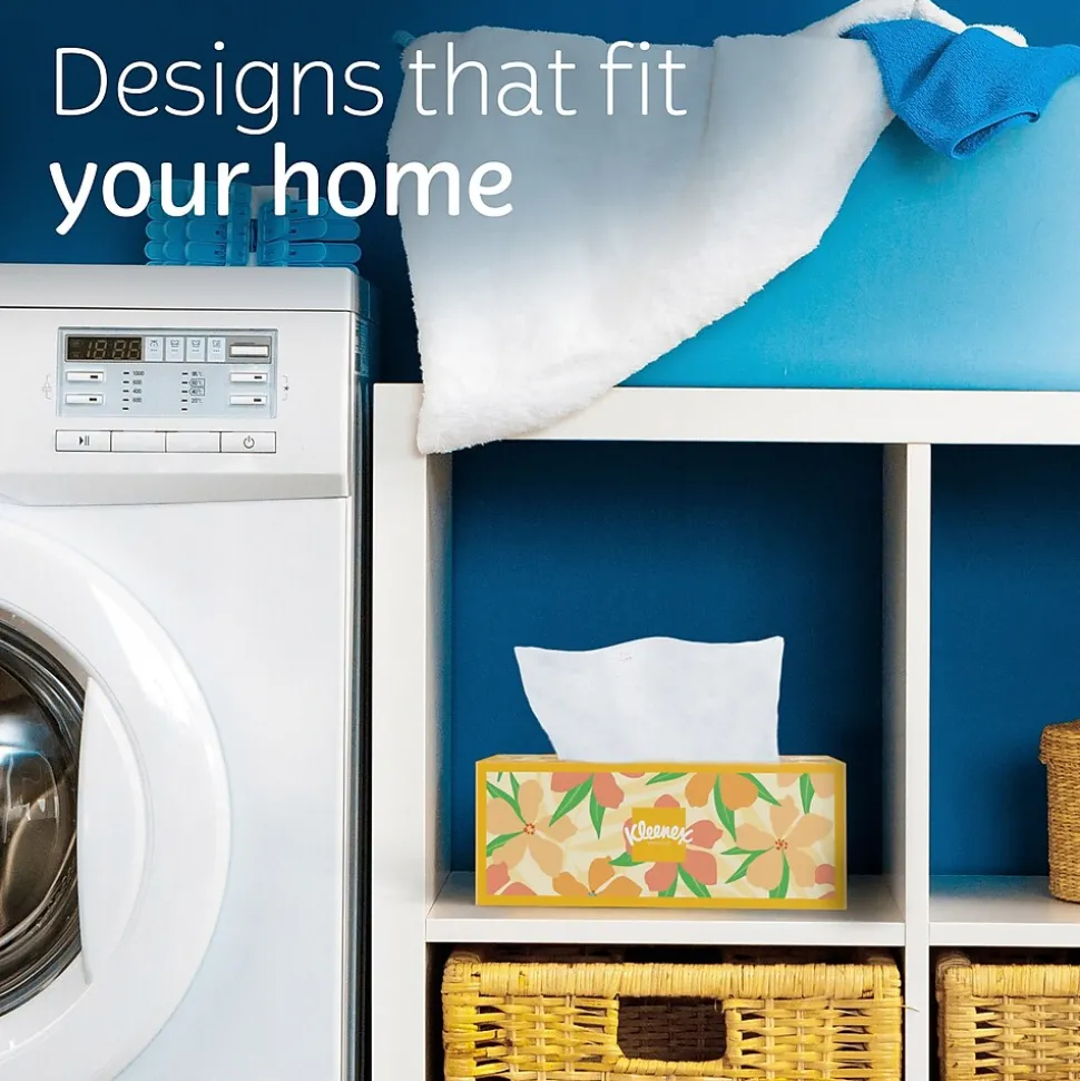 Prevent drippy noses and reduce the spread of germs with this convenient three-box pack of soft, unscented facial tissue. Each box is printed with a vibrant pattern to add a decorative touch to any home or office space. Each box in this pack contains 144absorbent Kleenex facial tissues to last all flu season.