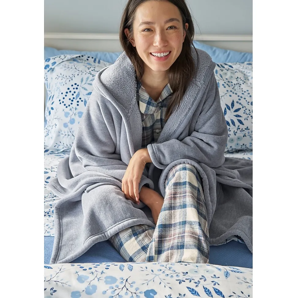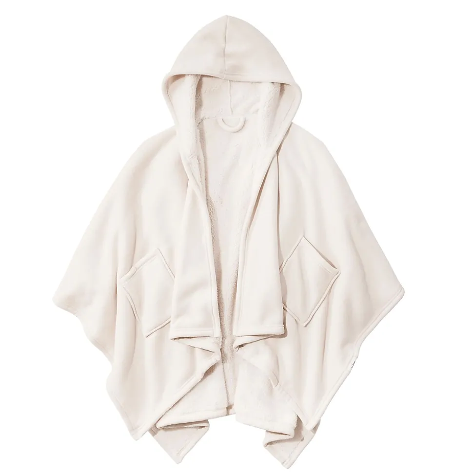 - The warmth of a throw and the comfort of a hooded wrap, all in one.