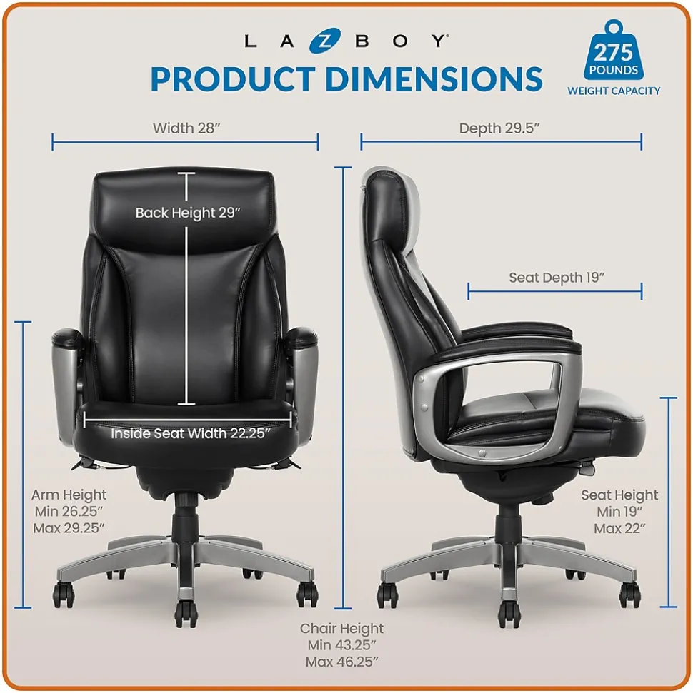 - Upholstered in black soft bonded leather seating surfaces