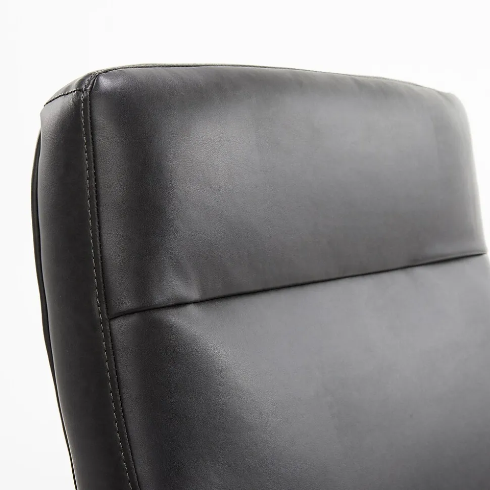 - Black faux leather offers smooth seating, while brushed nickel metal accents add subtle luster