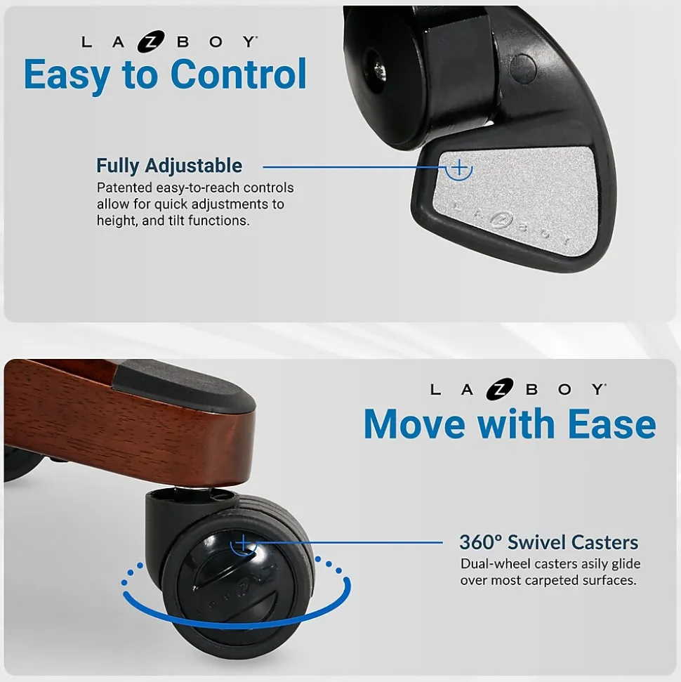 Give your workspace an air of sophistication with this La-Z-Boy Bradley executive chair. The soft bonded leather upholstery offers a rich, inviting texture, while the warm color scheme delivers classic style. The elevated headrest, built-in lumbar support and curved waterfall seat provide all-day comfort. This desk chair features simple controls, so you can adjust the seat height and tilt tension to meet your personal preferences. A sturdy five-star base and rolling casters make it easy to move this chair from your desk to a nearby filing cabinet, credenza or printer stand. Complete with rich wood-finish accents, this La-Z-Boy Bradley executive chair brings CEO-worthy good looks to your corner office.
