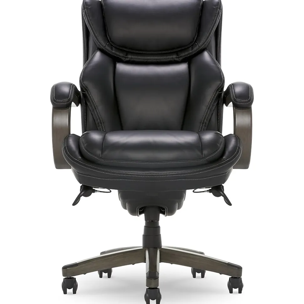 This La-Z-Boy Harnett executive office chair is designed for comfort by offering superior ergonomic features, with unique style. The chair uses ComfortCore, an advanced foam layering system that offers zone-based support through strategic cushion mapping. This executive office chair features soft support at the front of the cushion, firmer support at the back of the cushion, and poly fiber fill comfort top layer for supreme comfort.