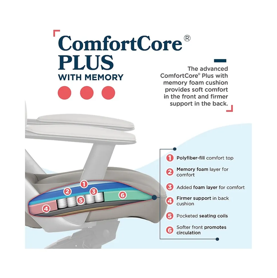 - Multilayered ComfortCore Plus memory foam seat construction, with soft comfort layers in the front and firmer support layers towards the back