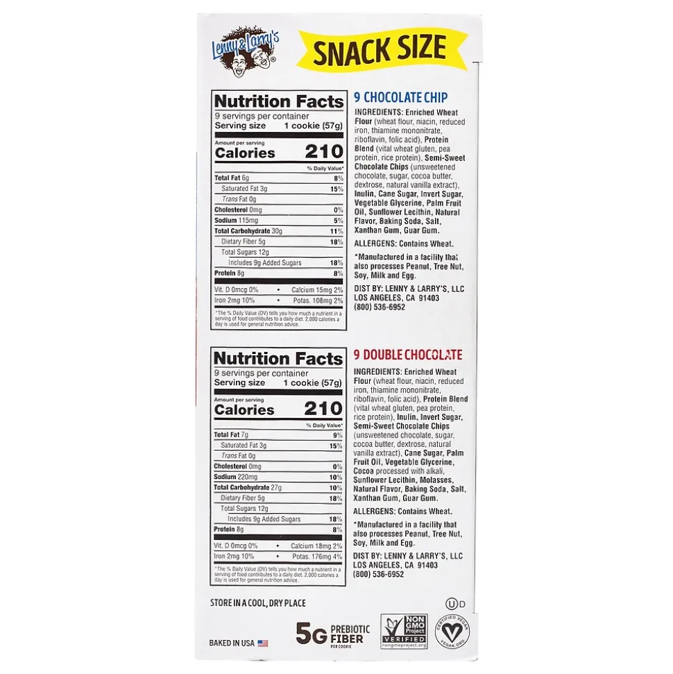 - 18 inividully wrapped cookies, 9 chocolate chip and 9 double chocolate