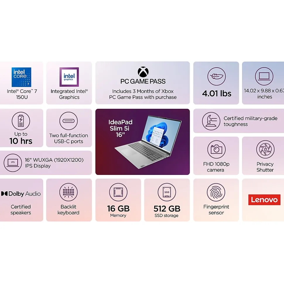 - 1.2GHz Intel Core 7 150U processor, with up to 5.4GHz speed and 12MB cache memory