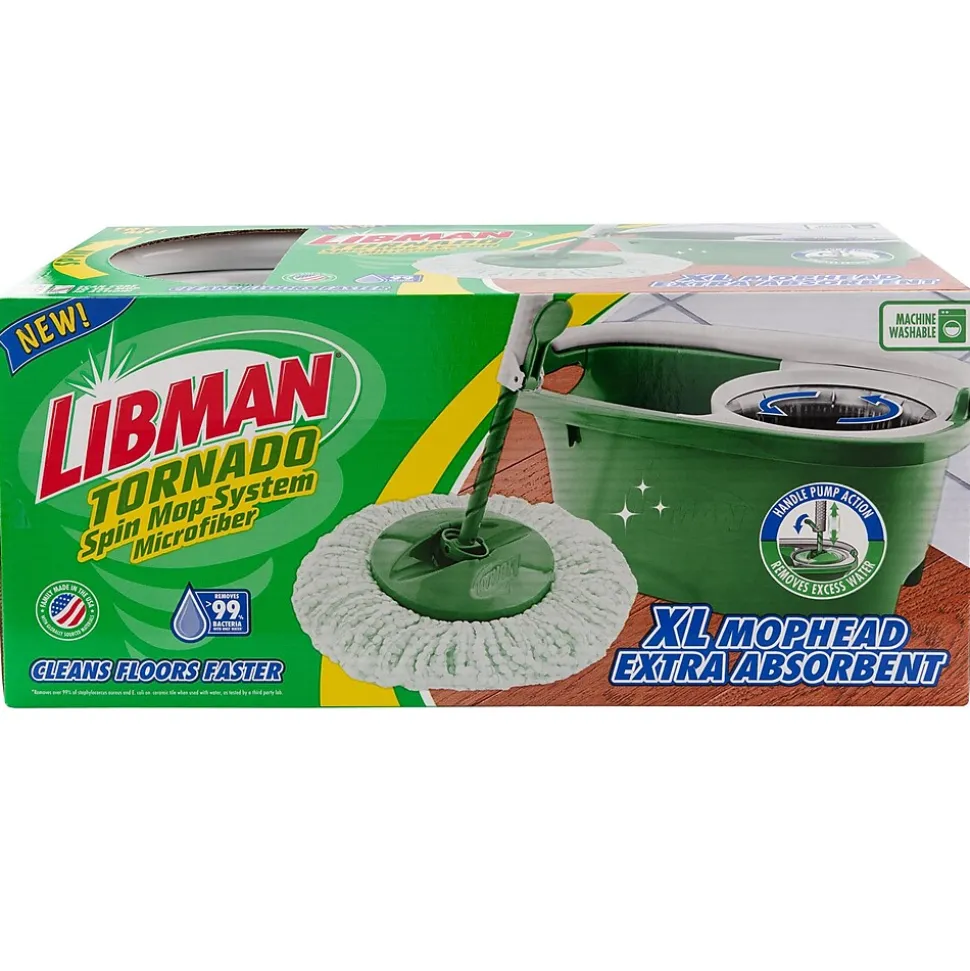 The Libman® Tornado Spin Mop™ System is a convenient all-in-one mopping system. It is designed with a large, microfiber, machine-washable mop head that absorbs and removes more water so your floors dry quickly. The microfiber is tough enough for dirt and grime but soft enough that it won’t scratch floors and can be used on any hard floor surface. The heavy-duty bucket and spinning chamber work to remove water and dirt efficiently from the mop head. The 2-gallon bucket is also designed to prevent tipping while carrying and has a convenient pour spout for emptying. The lower handle is precision-molded and impact-resistant to last through all your toughest mopping jobs. You can unlock and push the handle down once for a damp mop or more times for a drier mop. The Libman® Tornado Spin Mop™ removes over 99% of bacteria with only water.*