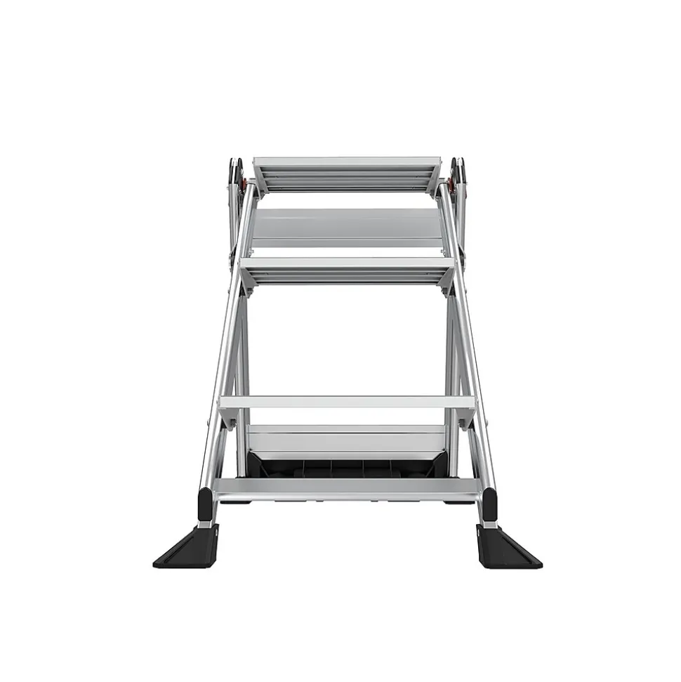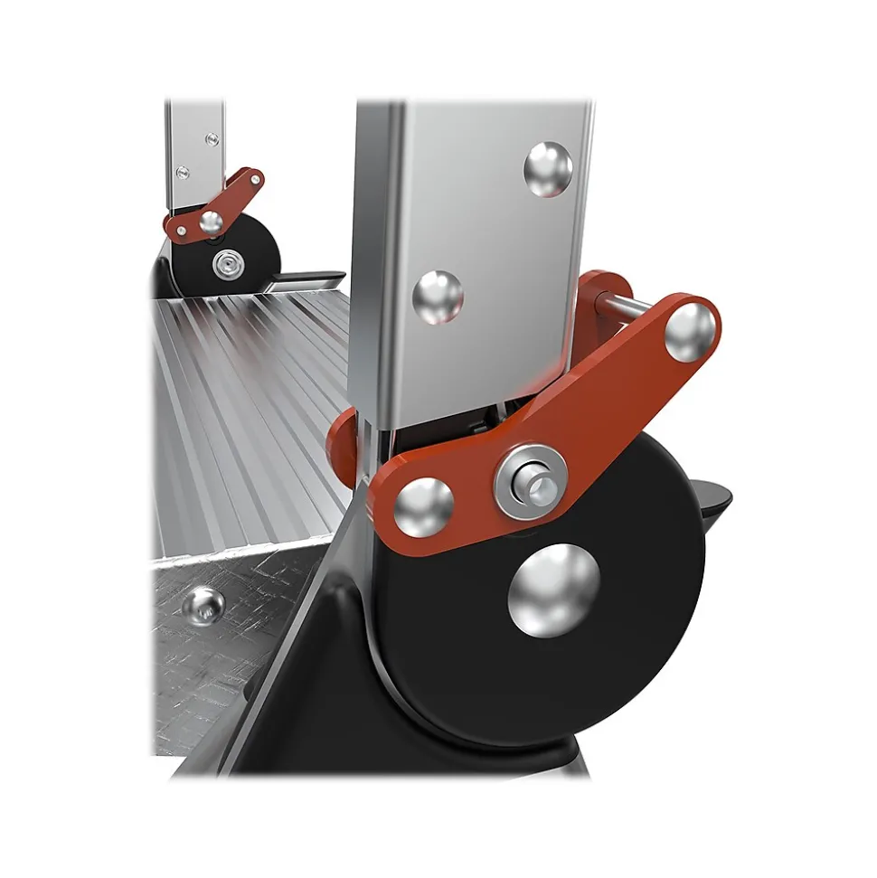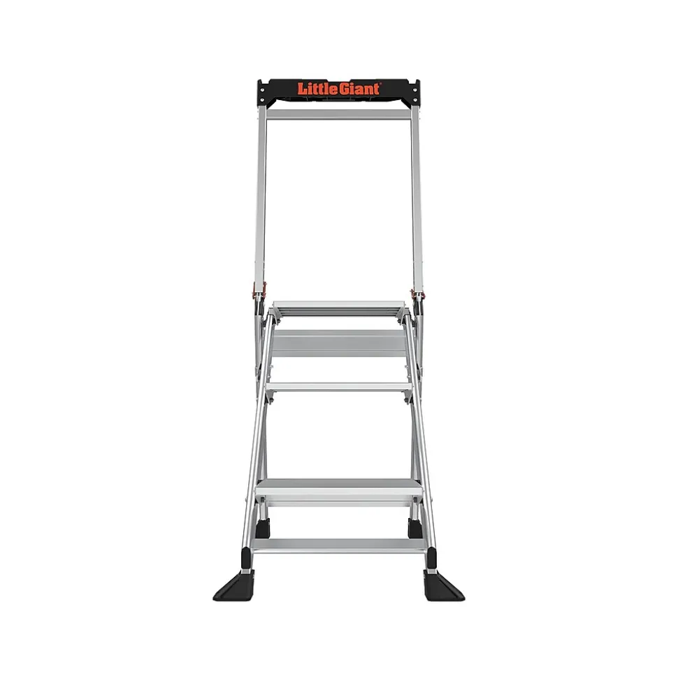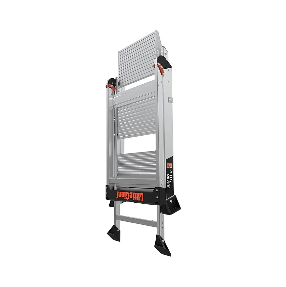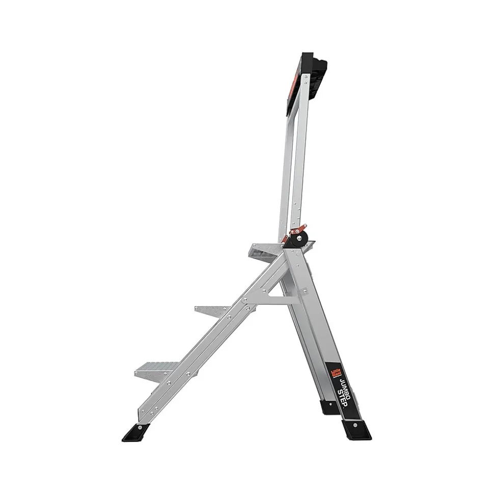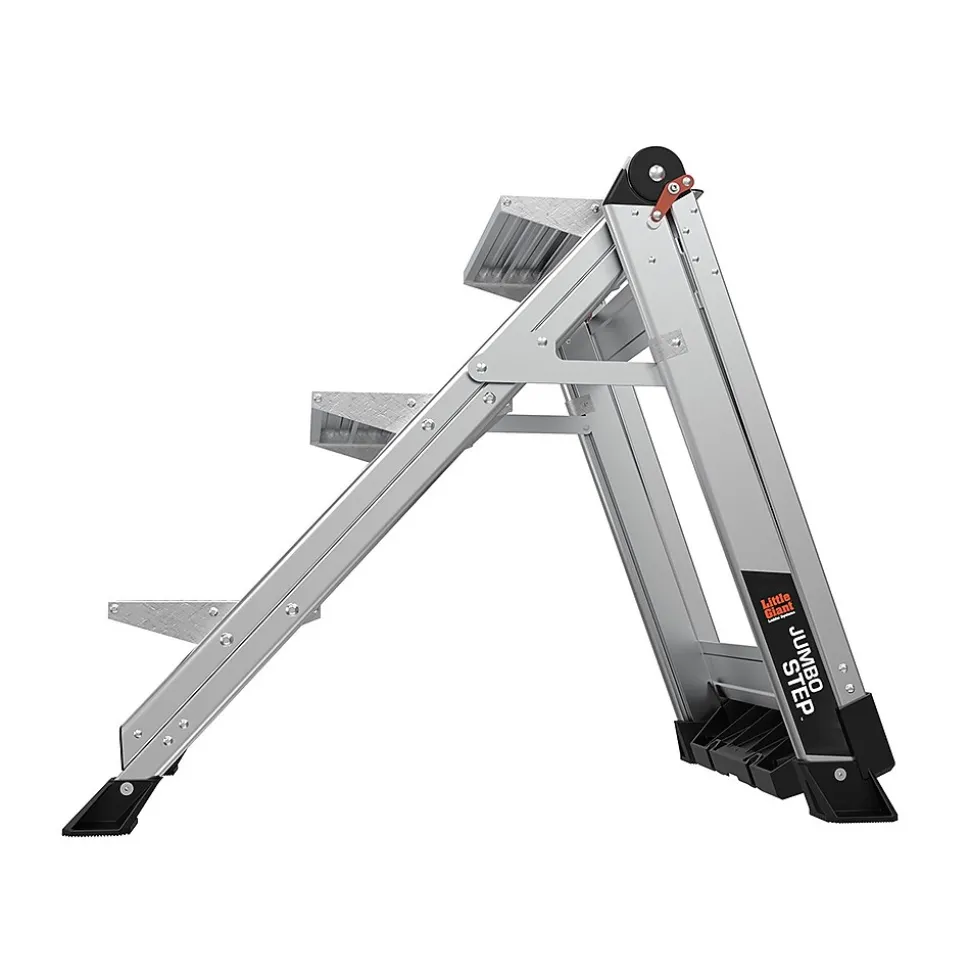 The stepladder offers an ultimate combination of light weight, stability, and strength. The safety bar is also a convenient tool tray. This stepladder is rated 375 lbs. for professional, industrial, and household use. The large 3″ x 2.25″ nonslip shoes provide great traction over almost any surface, including drains and grates. This Little Giant Ladder Systems Jumbo Step 3.5′ stepladder is simple to store with a 4.5″ storage depth.