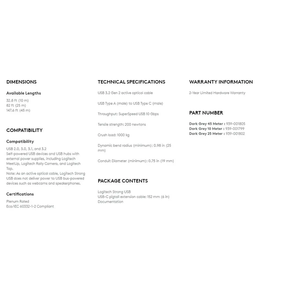 With up to 15x the reach of ordinary USB 3.x cables, Logitech Strong USB lets you separate USB peripherals and a host PC by up to 45 meters (147.6 ft). These active optical cables are plenum-rated and ECA certified for commercial installation in walls, above ceilings, through raceways, and within standard ¾” conduit