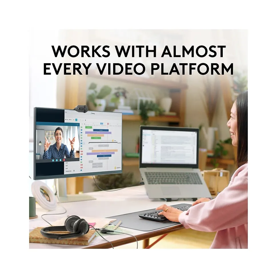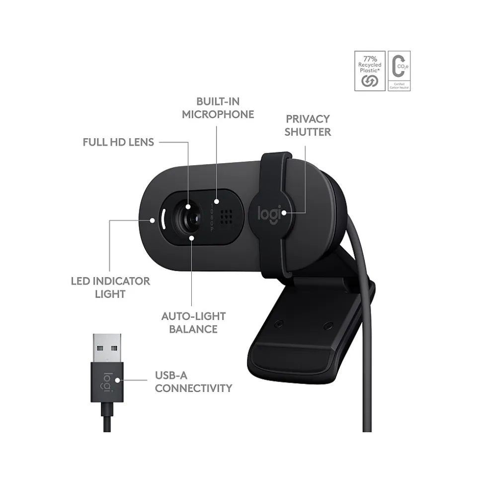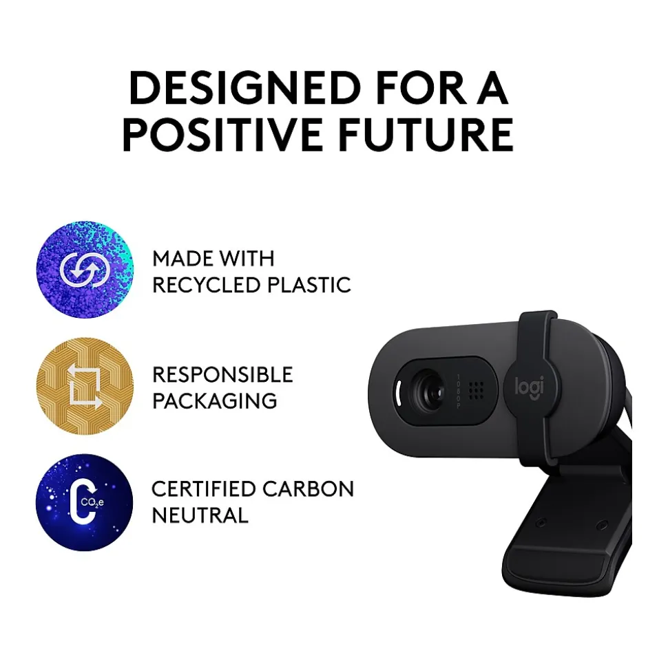 Look, sound, and meet better with the Logitech Brio 100, a simple and affordable webcam that lets you show your best self in video calls. Full HD (1080p) resolution and auto-light balance bring clarity and brightness to your calls, so you look your best. Sound better with a built-in microphone, and get total privacy with an integrated shutter. The Brio 100 comes in fun, sophisticated colors that let you express yourself at your workspace. Made with a minimum of 34% recycled plastic.