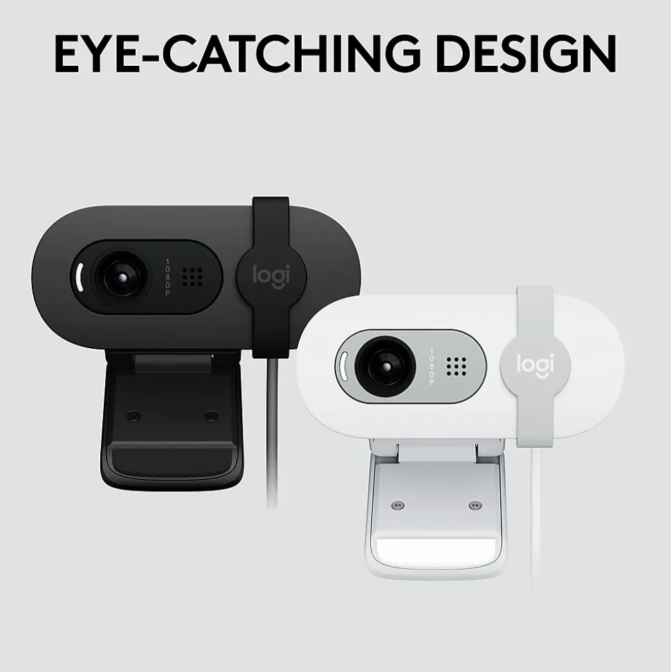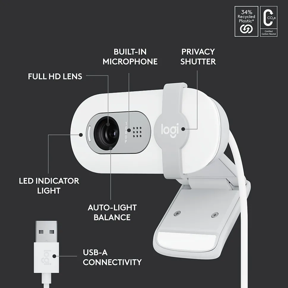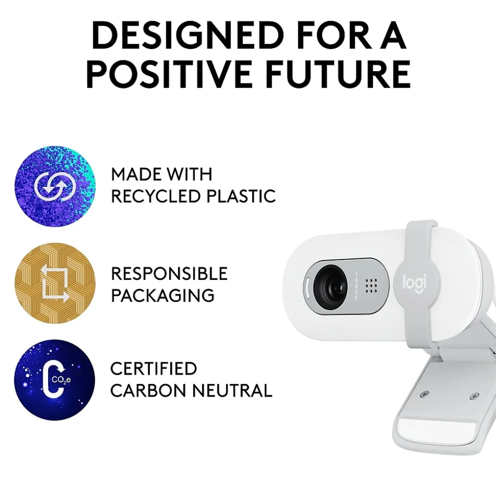 Look, sound, and meet better with the Logitech Brio 100, a simple and affordable webcam that lets you show your best self in video calls. Full HD (1080p) resolution and auto light balance bring clarity and brightness to your calls, so you look your best. Sound better with a built-in microphone, and get total privacy with an integrated shutter. The Brio 100 comes in fun, sophisticated colors that let you express yourself at your workspace. Made with a minimum of 34% recycled plastic.