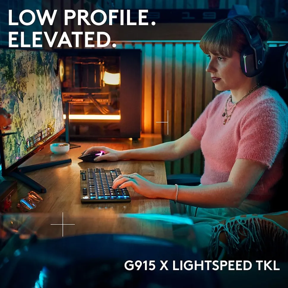 Unleash Your Gaming Potential with the Logitech G915 X LIGHTSPEED TKL Wireless Gaming Keyboard Elevate your gaming experience with the Logitech G915 X LIGHTSPEED TKL, designed for gamers who demand speed, precision, and customization. This tenkeyless keyboard features tri-mode connectivity, allowing you to effortlessly switch between LIGHTSPEED wireless, Bluetooth, and wired modes, ensuring seamless integration with all your devices. With low-profile GL mechanical switches that offer a 1.3 mm actuation point, you can enjoy lightning-fast response times and enhanced accuracy for every action. The ultra-slim design, combined with durable double-shot PBT keycaps and a brushed aluminum alloy top plate, provides both style and sturdiness for intense gaming sessions. Experience vibrant LIGHTSYNC RGB lighting with approximately 16.8 million colors, enabling you to create personalized illumination and immersive themes that sync with your gameplay. Take control with KEYCONTROL, allowing up to 15 customizable functions per key, and enjoy easy access to media controls for seamless entertainment. Key Features: Tri-Mode Connectivity: LIGHTSPEED wireless, Bluetooth, and wired modes for versatile use Low-Profile Mechanical Switches: Fast actuation for increased performance Ultra-Slim Design: Sleek and compact for a clutter-free setup Customizable LIGHTSYNC RGB: 16.8 million colors for personalized lighting effects KEYCONTROL: Up to 15 programmable functions per key for complete control Upgrade to the Logitech G915 X LIGHTSPEED TKL Wireless Gaming Keyboard and experience the future of gaming today!