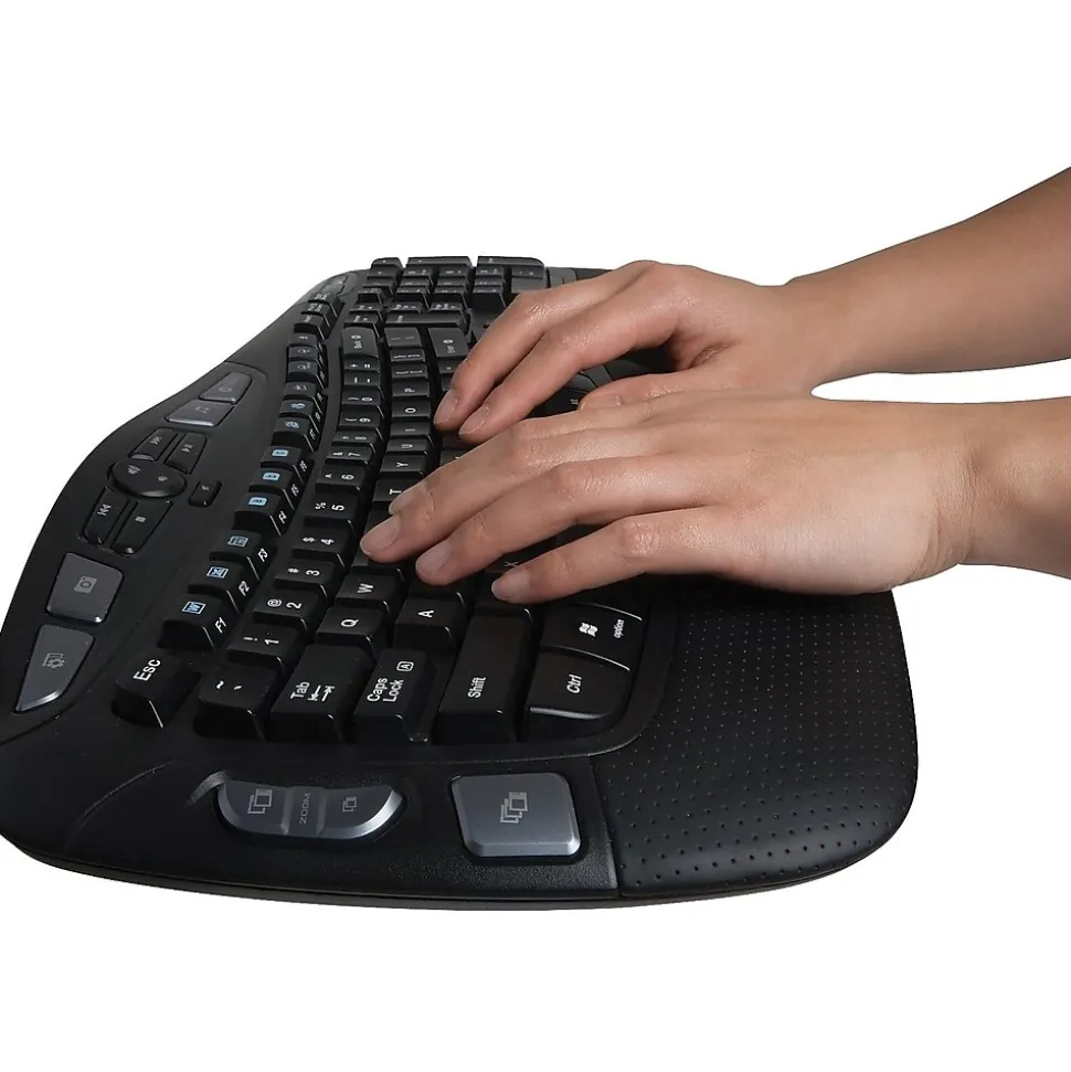Give your wrists a rest with this Logitech Wireless Keyboard K350. A cushioned palm rest and curved design put your hands at the perfect angle for typing. Featuring programmable keys and convenient media buttons, along with a unique key layout, this Logitech Wireless Keyboard K350 puts essential controls at your fingertips.