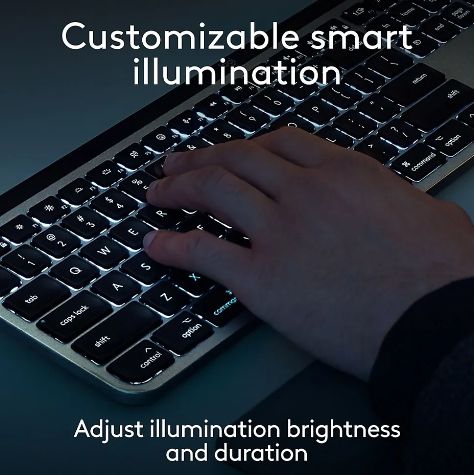 Introducing MX Keys S for Mac — a low-profile wireless keyboard optimized for macOS and iPadOS(4) With a Mac-specific key layout, matching Apple finishes, and a design that blends into your Apple setup. Offers a fast fluid precise typing experience, and customizable, time-saving Smart Actions that automate your most repetitive tasks with a single keystroke. The smart backlighting lights up as your fingers approach the keyboard and automatically brightens or fades to suit the time of day. Now you have more control of your backlighting brightness and duration with Logi Options+. (1)
