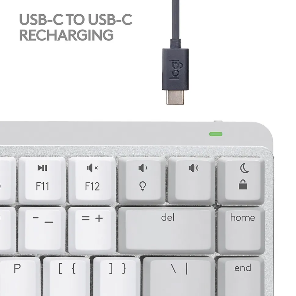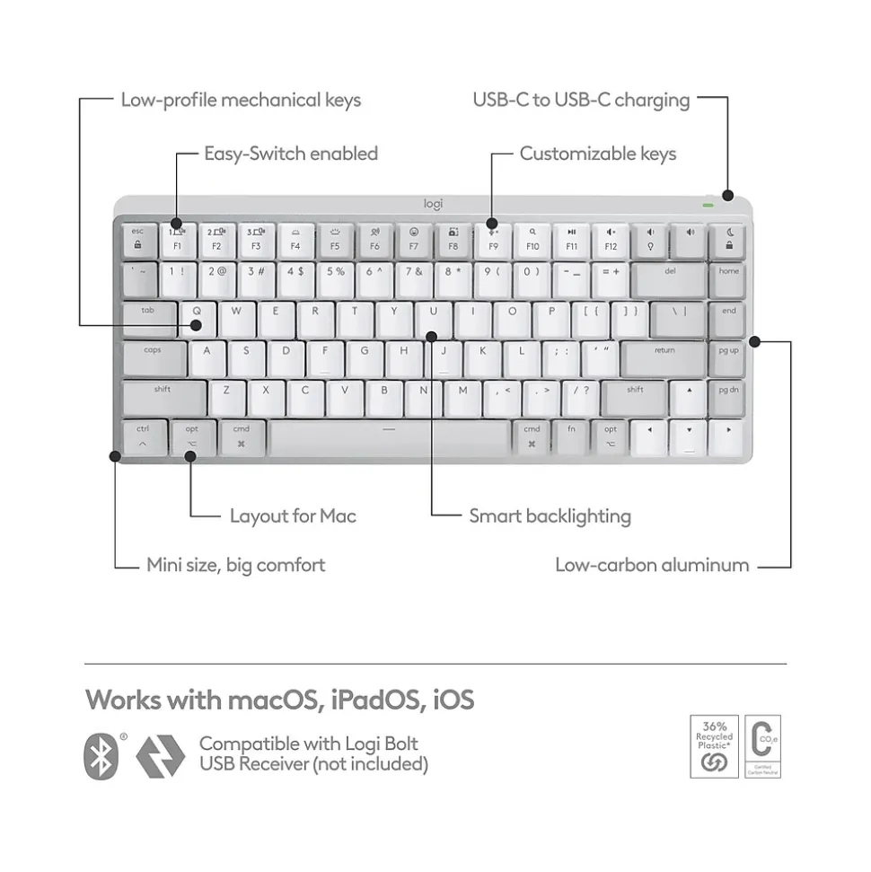 Introducing the MX mechanical mini for Mac, a minimalist keyboard mastered for Mac with a dual-color key layout for Mac computers to help improve precision through your peripheral vision. The MX mechanical mini for Mac is crafted for ergonomic comfort with tactile, quiet low-profile mechanical switches that allow you to create in a natural position longer, and battery-saving smart backlighting that keeps your creativity going. Connect instantly with up to three devices via Bluetooth Low Energy, and switch between them with a push of a button. Charge while you work with USB Type-C to USB Type-C quick charging.