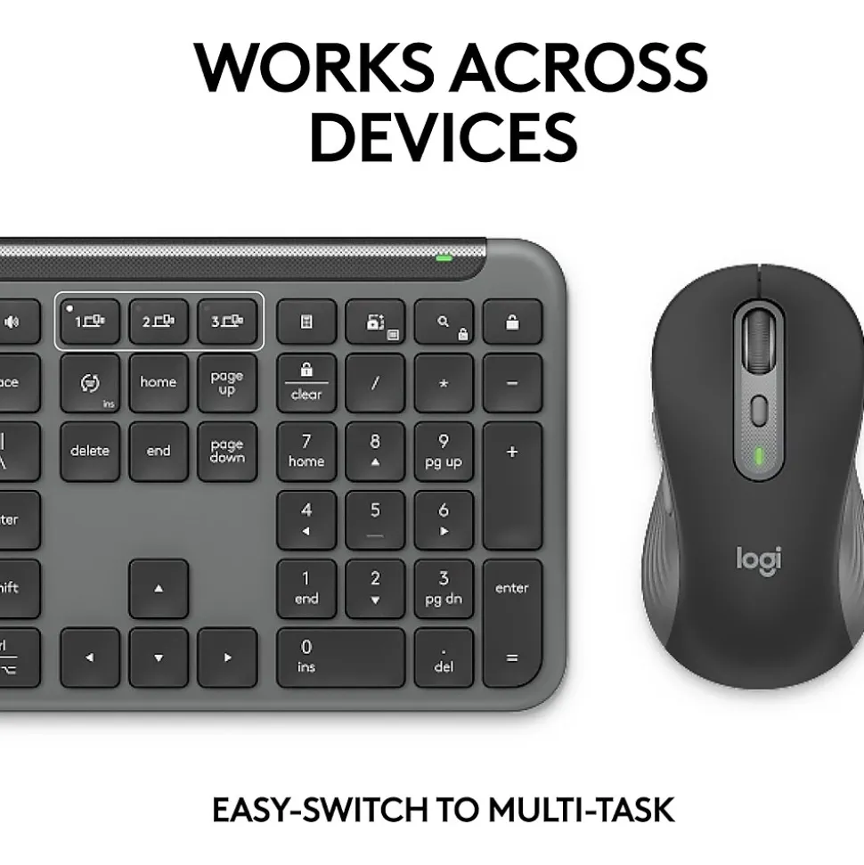 - Works Across Devices: Connect wirelessly via Logi Bolt or Bluetooth and seamlessly switch between 3 of your devices with a press of the Easy-Switch button for easy multitasking