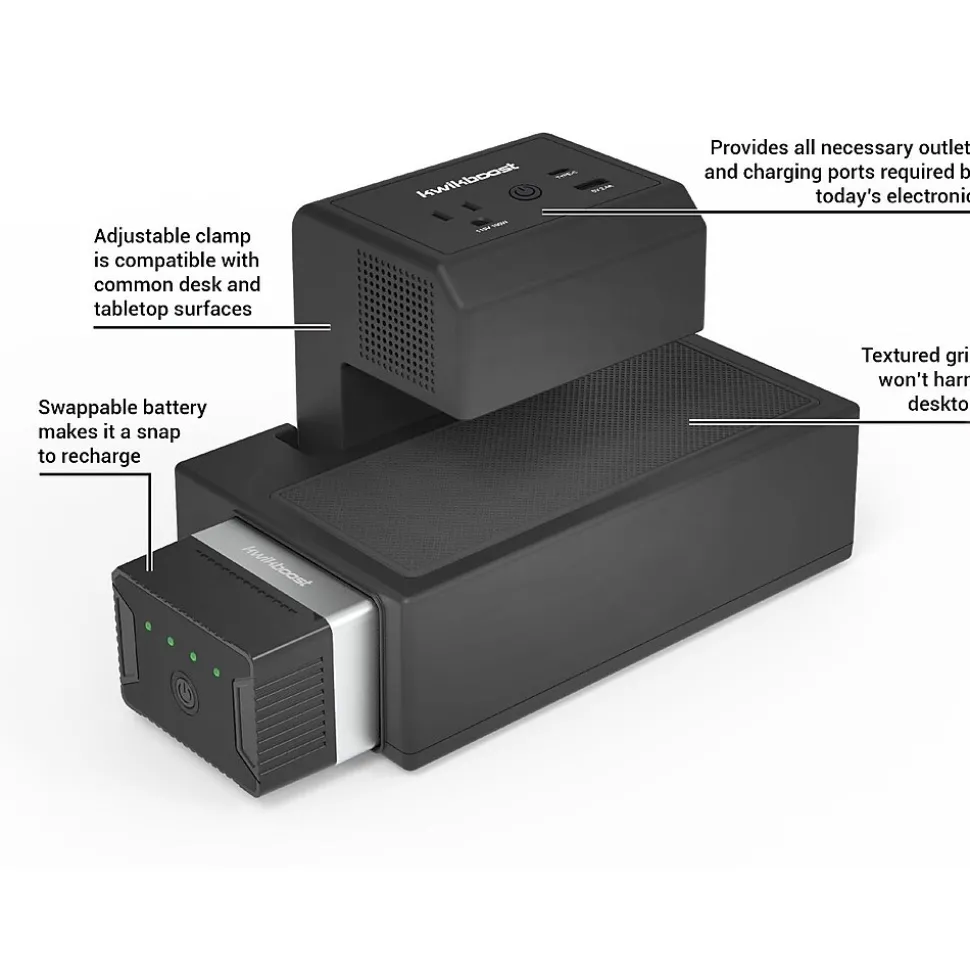 Enjoy convenient cordless charging of mobile devices. The Luxor KwikBoost EdgePower desktop charging station system is a total solution for laptops and mobile devices in workspace and classroom environments. KwikBoost EdgePower eliminates extension cords by putting power right where you need it. The clamp-on desktop charging unit features an innovative design that easily attaches to most tables and desktops. Once connected, the station offers a standard AC outlet, a USB Type-A charging port, and a USB Type-C PD charging port. When loaded with a freshly recharged EdgePower rechargeable battery, the charging station has enough power to charge a typical laptop up to two times, a standard Chromebook or tablet up to four times, and an average smartphone up to 14 times. The charging unit can also charge a laptop and two mobile devices simultaneously.
