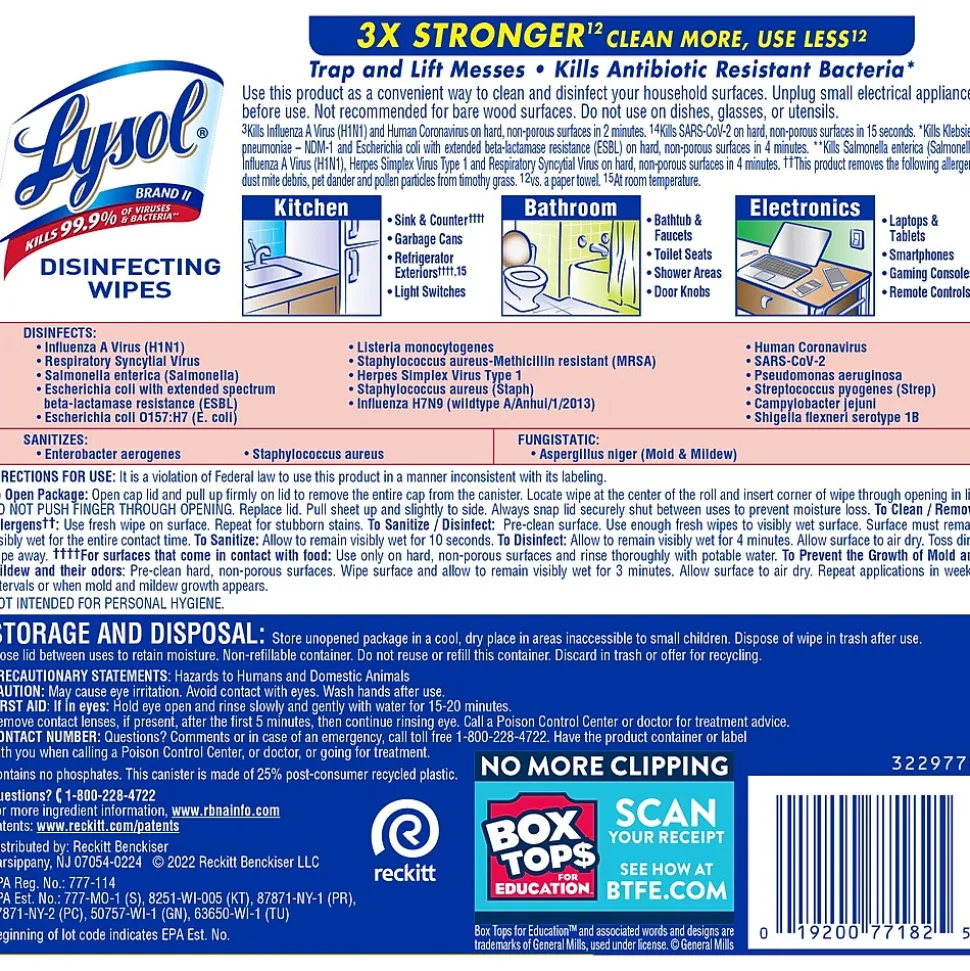 - Kills 99.9% of viruses and bacteria, including cold and flu viruses, Salmonella, E. Coli, MRSA, RSV, Staph, and Strep, when used as directed on hard, non-porous surfaces.