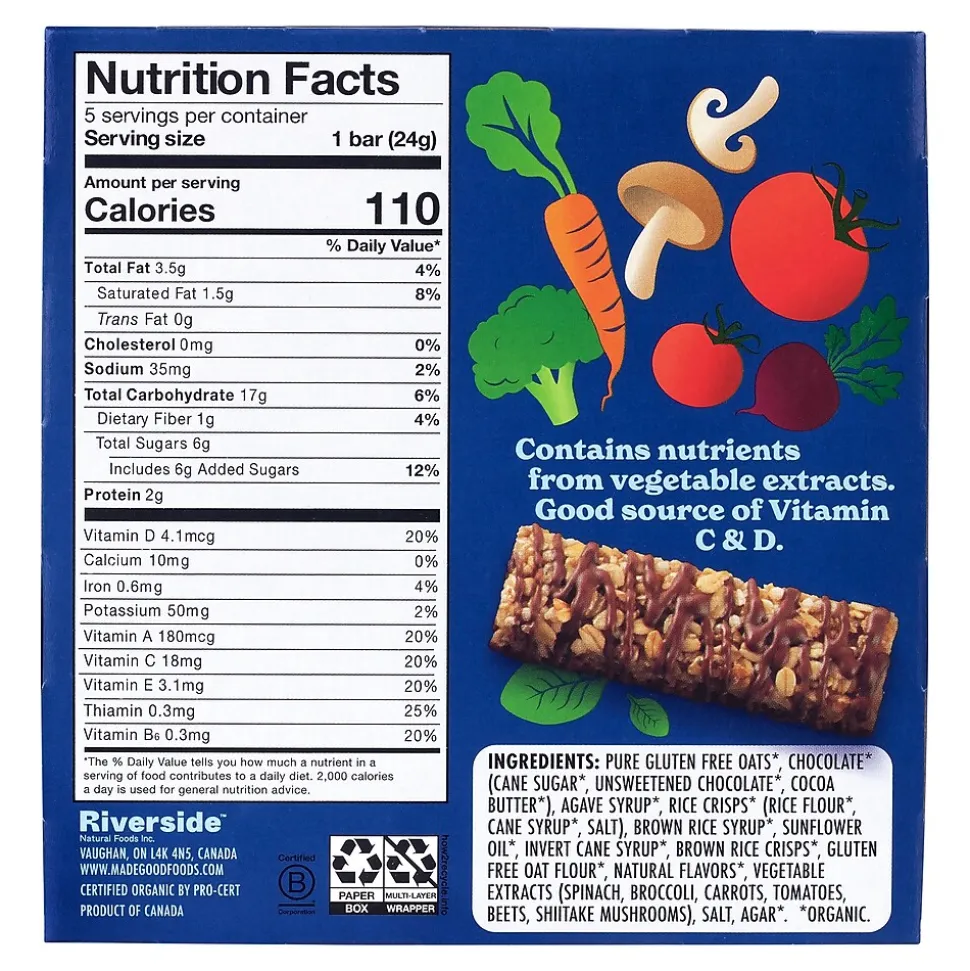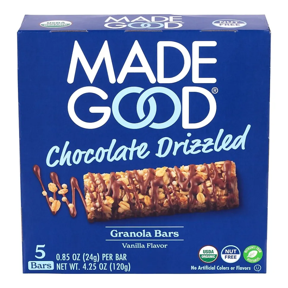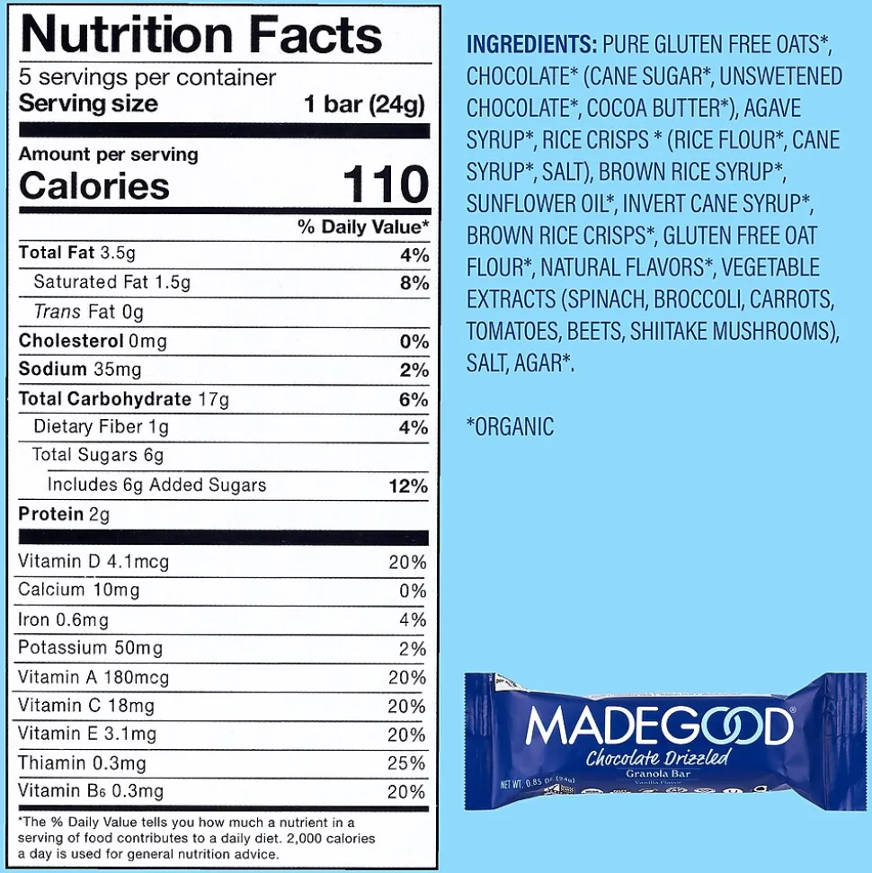 When MadeGood goes decadent, we go for it! Meet the Vanilla Granola Bar, drizzled and dipped in delicious chocolate. Chewy and rich together. Organic, gluten-free, and free from the most common allergens. Vanilla and chocolate together, plus a full serving of veggies baked inside too.