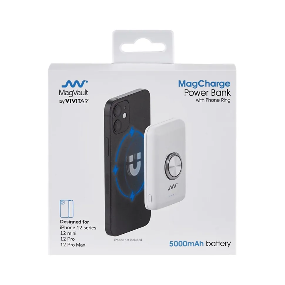 The MagVault by Vivitar 5000mAh wireless power bank is compatible with iPhone 12/12 Pro/12 Pro Max/12 mini cases with magnets. Magnetic design snaps into place quickly and securely. Equipped with temperature control and foreign object detection safety features.
