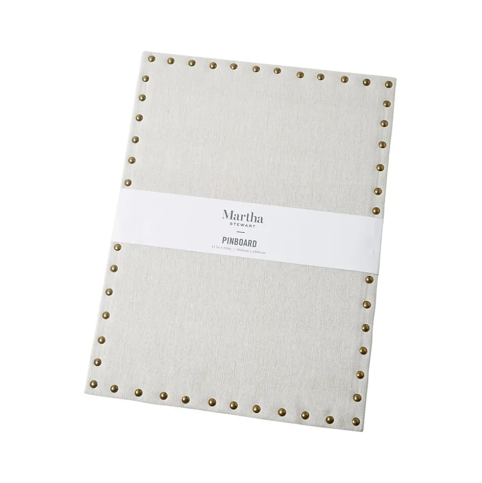 The Martha Stewart bulletin board brings a fresh and modern profile to a classic bulletin board. Use any pushpins, thumbtacks, or map pins you like to pin up notes, photos, reminders, and more. Frameless board is accented with metal nail heads creating a framed-like design.