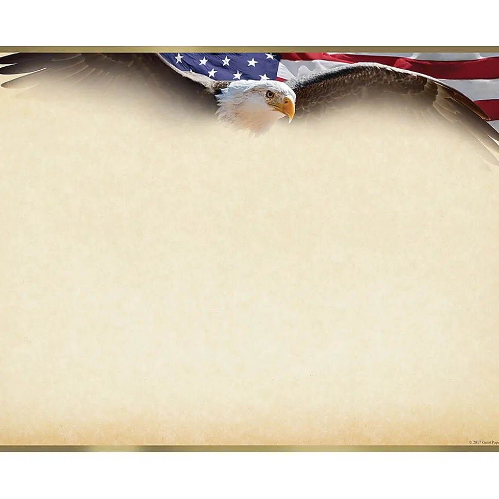 Flying Eagle Certificate features gold foil accents. Certificate is compatible with most inkjet and laser printers. Visit www.greatpapers.com for easy to use printing template.