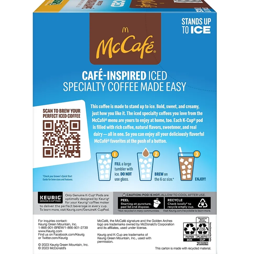 Inspired by McDonald’s McCafe specialty coffees, now you can enjoy the rich chocolaty flavor and bold coffee taste of the McCafe iced Mocha Frappe right in your kitchen. Bold, sweet, and creamy, the one-step Mocha Frappe gives you the best of McDonald’s McCafe specialty coffees in your cup, just how you like it. An all-time McCafe favorite, this deliciously refreshing iced coffee beverage is bursting with rich, chocolaty flavor and bold coffee taste. This coffee is made to stand up to ice. Each K-Cup pod is filled with rich coffee, natural flavors, sweetener, and real dairy, all in one, so you can enjoy your deliciously flavorful McCafe iced Mocha Frappe at the push of a button. Every McCafe K-Cup pod is compatible with any Keurig single serve coffee maker, so the iced specialty coffee you love is now yours to enjoy at home. Enjoy the same great-tasting coffee you know and love, and when you’re done, just peel, empty, and recycle.