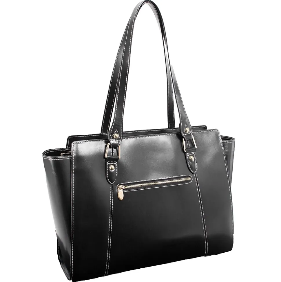 - Tote features elegant Gold Key Chain. Easy Access Exterior back pocket. One pocket perfect for tablets. Secure zipper pocket. Two Leather reinforced accessory slip pockets.
