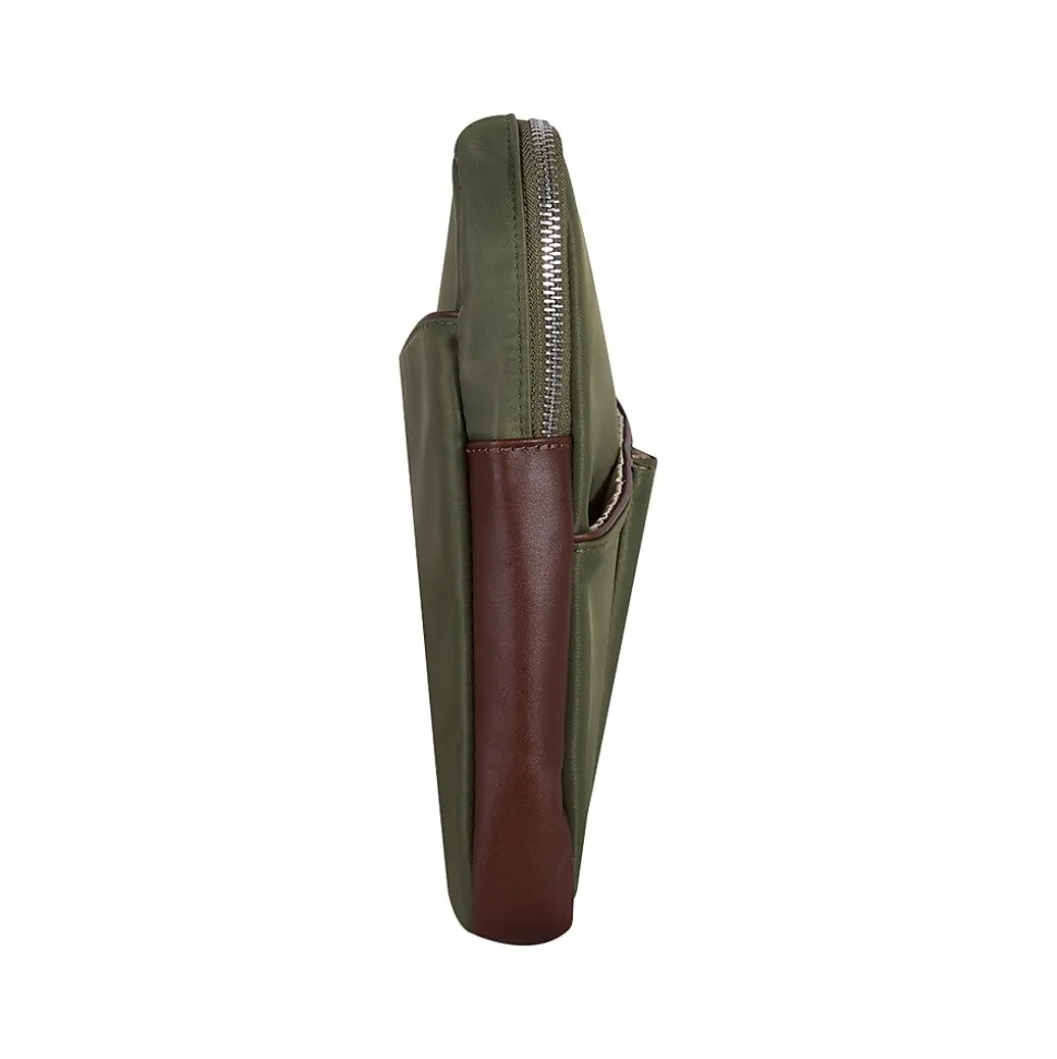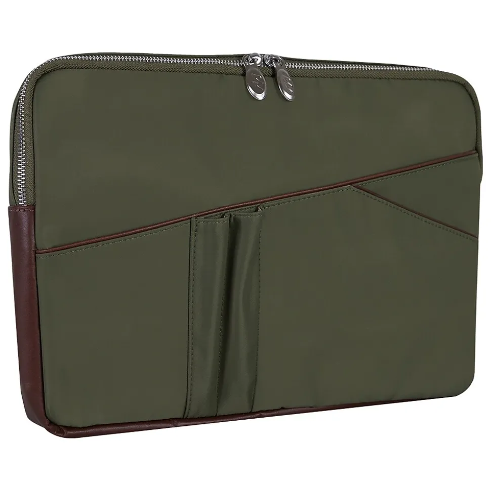 This padded nylon laptop sleeve with leather accents has a fully lined interior. It also features an easy-access front organizer for pens and accessories and a back full-length file pocket.