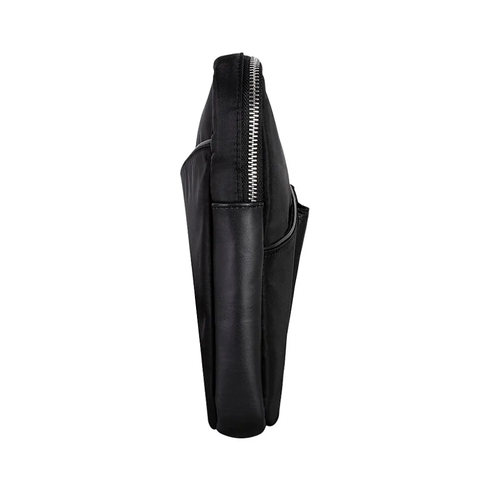 This padded nylon laptop sleeve with leather accents has a fully lined interior. It also features an easy-access front organizer for pens and accessories and a back full-length file pocket.