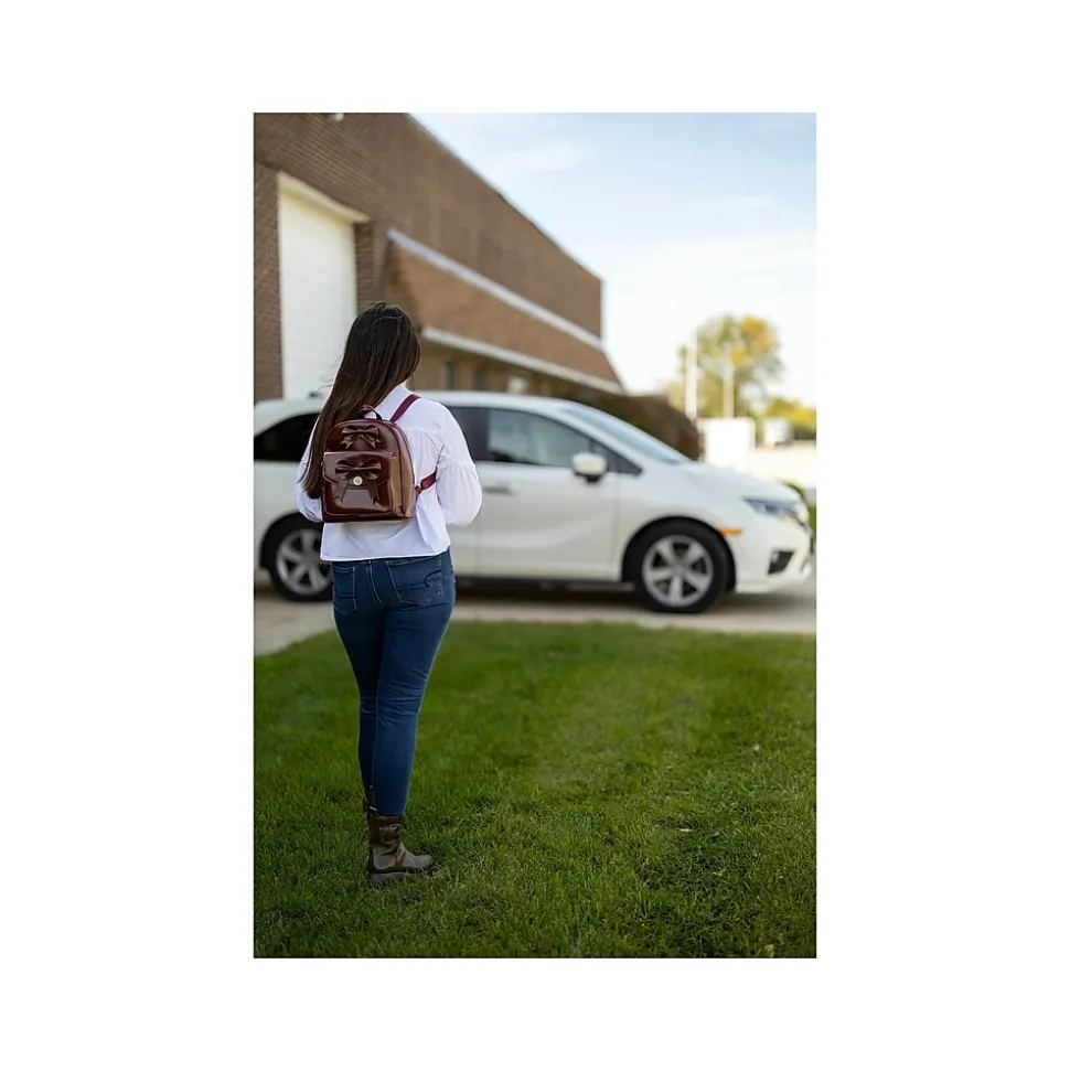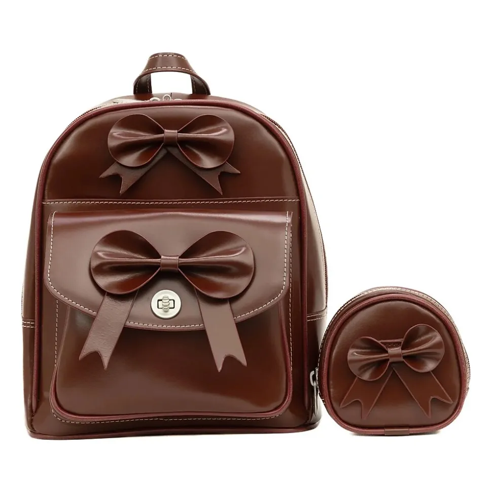 This McKleinUSA ACADIA mini bow backpack features two front pockets: one with twist lock and a slip one. The main compartment features a zipper pocket, two slip pockets, and a multipurpose pocket that can store a mini tablet. The zippers on the main compartment can be locked. The interior is fully lined, and there is also a hidden zipper pocket on the back. The backpack also features adjustable straps and a handle hook for carrying or hanging. Comes with a matching coin purse.
