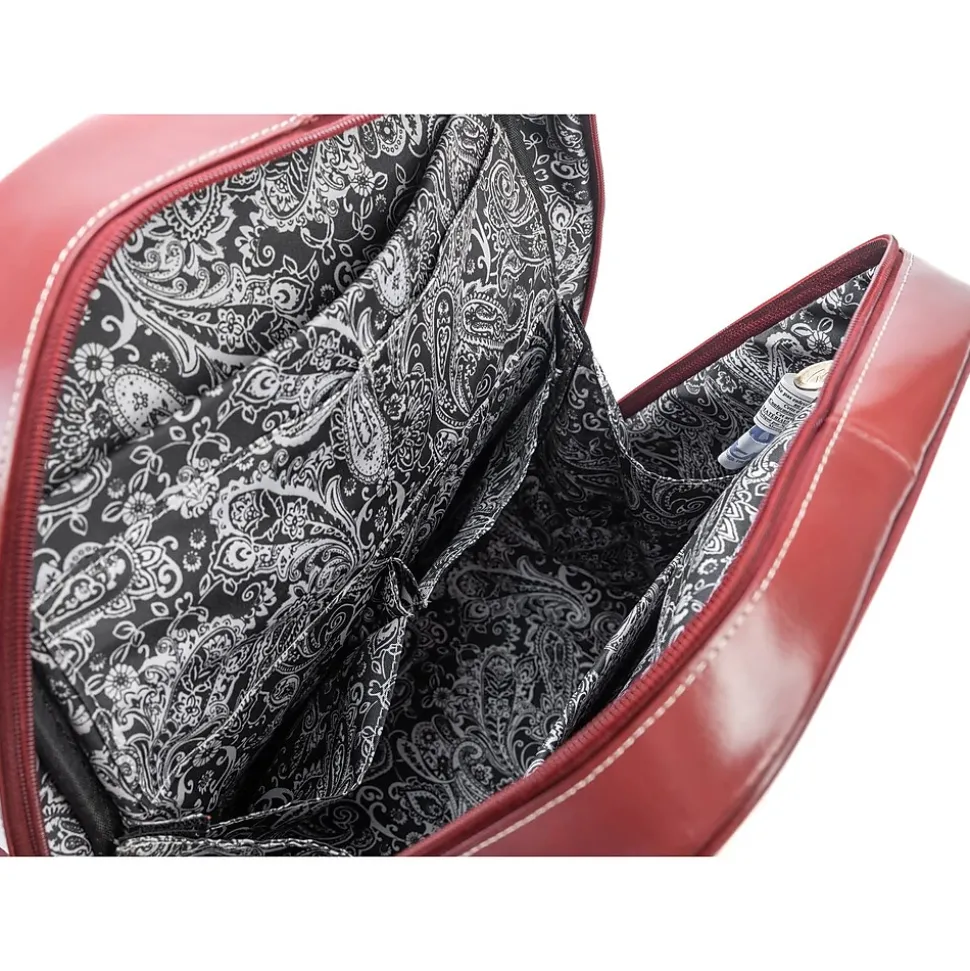 The McKleinUSA KENDALL business laptop/tablet backpack features a front pocket with clasp turn closure, a front flap-over with clasp turn closure, a front slip pocket, and a front zipper pocket. The main compartment comes with a wide opening and an ability to unzip all the way down on each side. The backpack also features an interior laptop pocket, tablet pocket, and an interior zipper pocket, as well as two slip pockets for power cords, plugs, and accessories. The zippers to the main compartment can be locked. The backpack additionally comes with a fully lined interior and gold-tone hardware. More features include adjustable straps, back zipper pocket, handle hook for carrying or hanging, and protective metal feet on the base.