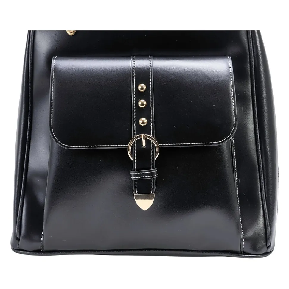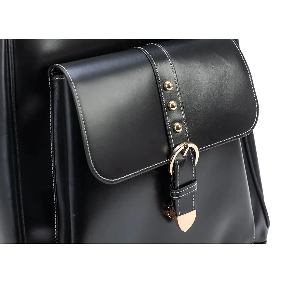 This McKleinUSA MADISON business laptop/tablet backpack features a front pocket with a magnetic clasp and a belt design on the front pocket, front zipper pocket, interior laptop pocket and tablet pocket, interior zipper pocket, four slip pockets for power cords, plugs, and accessories. The main compartment features a wide opening, with the ability to unzip all the way down on each side. The interior is fully lined, complete with hardware in a gold-tone finish. The backpack also features adjustable straps and a handle hook for carrying or hanging. Comes with protective metal feet on the base.