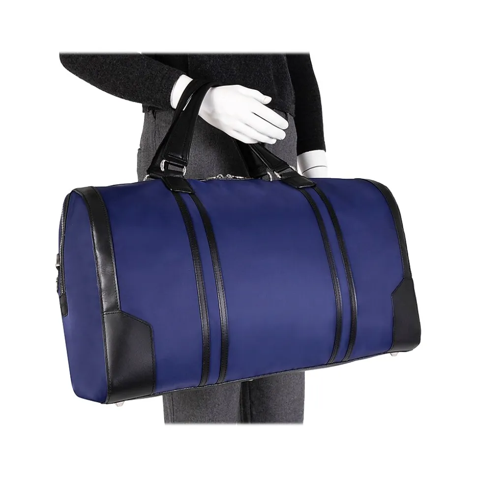 This spacious nylon duffel bag with leather accents has a fully lined interior. It also features an interior tablet pocket with an organizer for business cards, pens, and accessories and an easy-access secure back zipper pocket.
